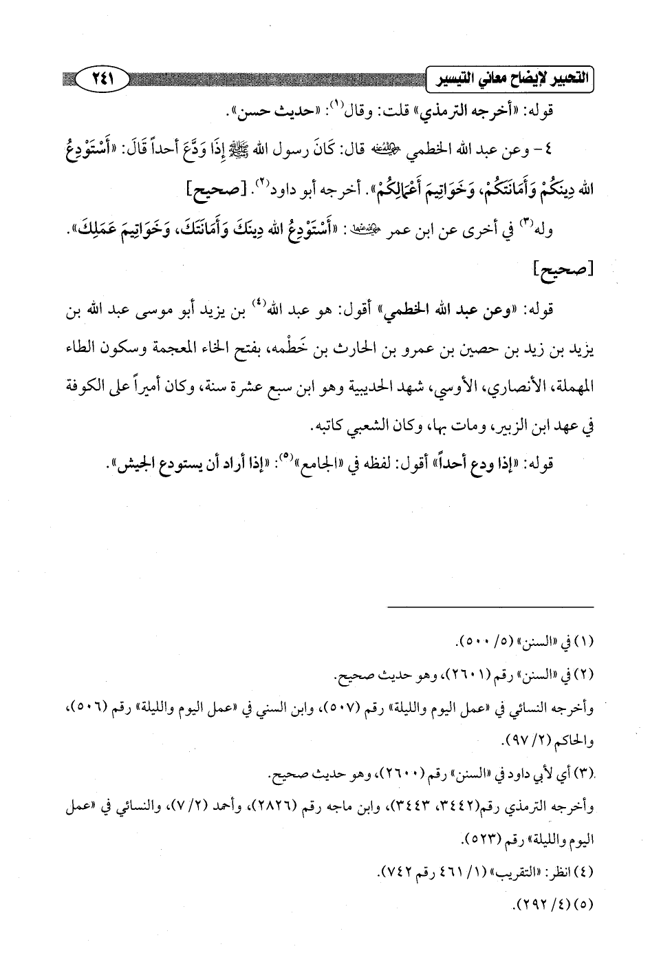 4 - وعن عبد الله الخطمي - رضي الله عنه - قال: كَانَ رسول الله - صلى الله عليه وسلم - إِذَا وَدَّعَ أحداً قَالَ: "أَسْتَوْدِعُ الله دِينَكُمْ وَأَمَانَتَكُمْ، وَخَوَاتِيمَ أَعْمَالِكُمْ". أخرجه أبو داود (¬2). [صحيح]