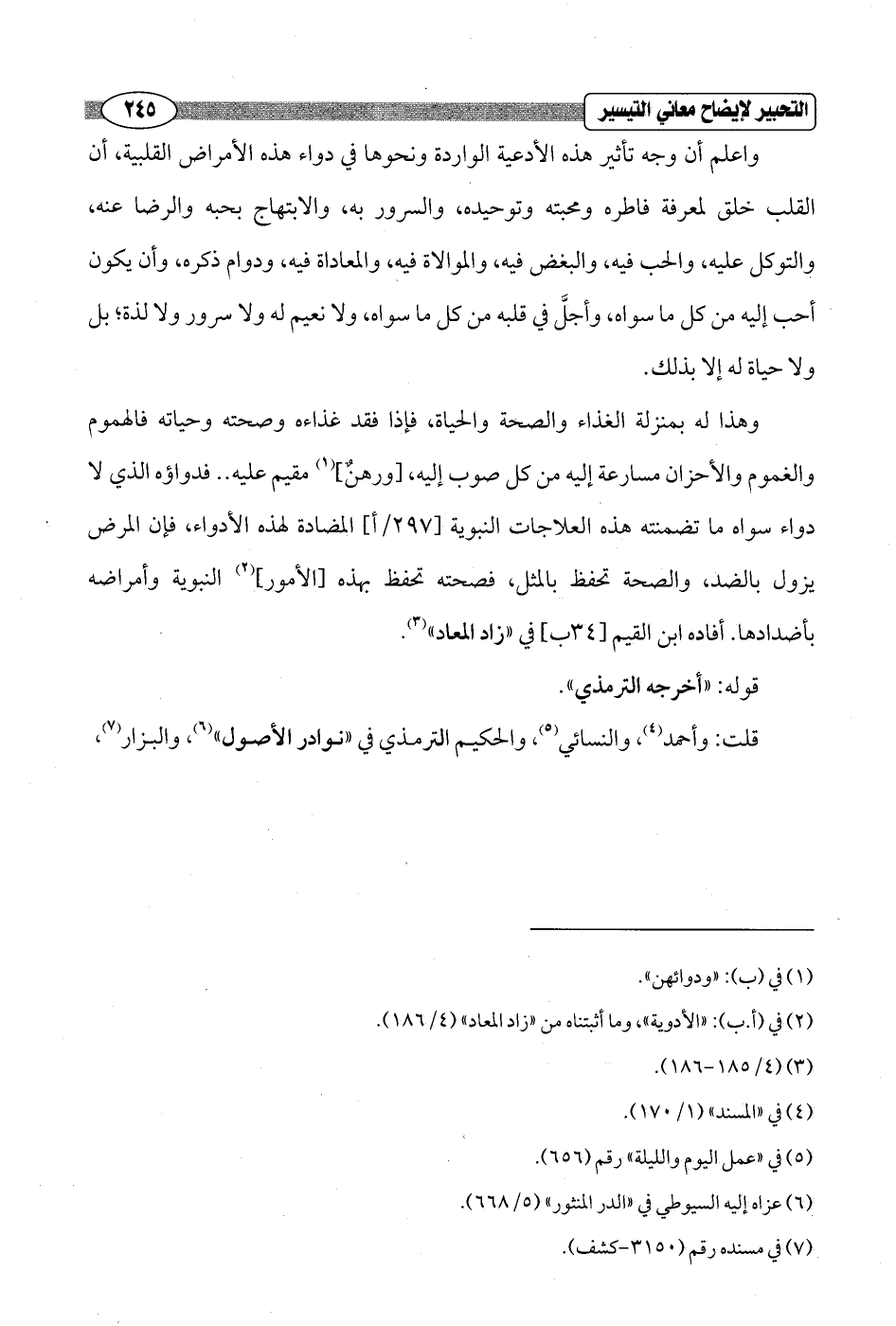 وهذا له بمنزلة الغذاء والصحة والحياة، فإذا فقد غذاءه وصحته وحياته فالهموم والغموم والأحزان مسارعة إليه من كل صوب إليه، [ورهنٌ] (¬1) مقيم عليه .. فدواؤه الذي لا دواء سواه ما تضمنته هذه العلاجات النبوية [297/ أ] المضادة لهذه الأدواء، فإن المرض يزول بالضد، والصحة تحفظ بالمثل، فصحته تحفظ بهذه [الأمور] (¬2) النبوية وأمراضه بأضدادها. أفاده ابن القيم [34 ب] في "زاد المعاد" (¬3).