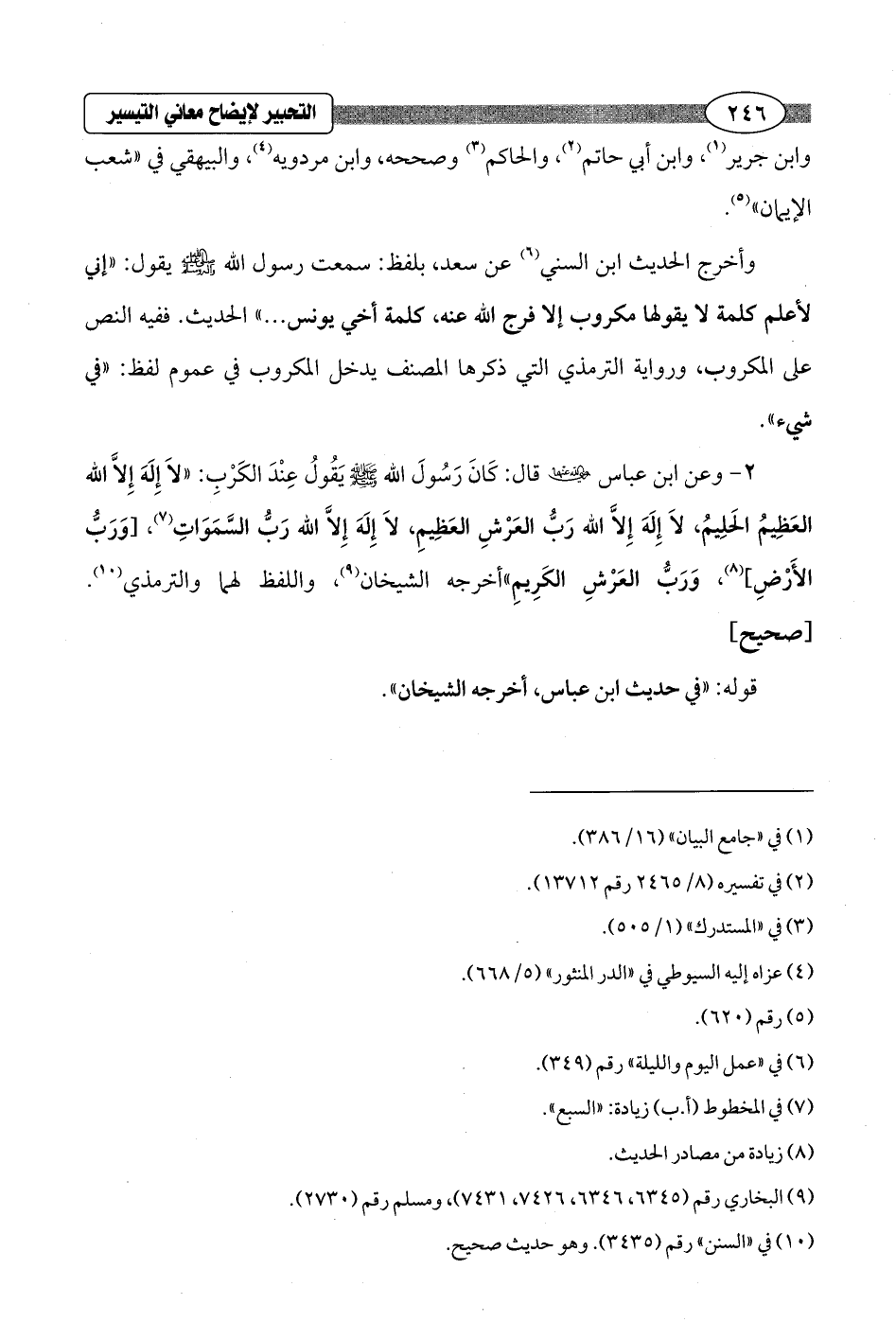 2 - وعن ابن عباس - رضي الله عنهما - قال: كَانَ رَسُولَ الله - صلى الله عليه وسلم - يَقُولُ عِنْدَ الكَرْبِ: "لاَ إِلَهَ إِلاَّ الله العَظِيمُ الحَلِيمُ، لاَ إِلَهَ إِلاَّ الله رَبُّ العَرْشِ العَظِيمِ، لاَ إِلَهَ إِلاَّ الله رَبُّ السَّمَوَاتِ (¬7)، [وَرَبُّ الأَرْضِ] (¬8)، وَرَبُّ العَرْشِ الكَرِيمِ" أخرجه الشيخان (¬9)، واللفظ لهما والترمذي (¬10). [صحيح]