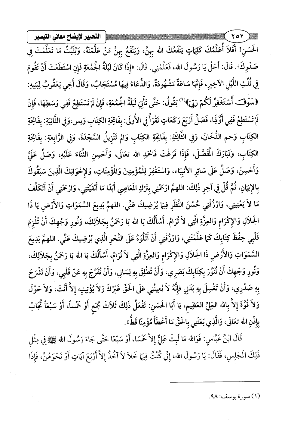 الحَسَنِ! أَفلاَ أُعَلِّمُكَ كَلِمَاتٍ يَنْفَعُكَ الله بِهِنَّ، وَيَنْفَعُ بِهِنَّ مَنْ عَلَّمْتَهُ, وَيُثبَّتُ مَا تَعَلَّمْتَ فِي صَدْرِك". قَالَ: أَجَلْ يَا رَسُولَ الله، فَعَلِّمْنِي. قَالَ: "إِذَا كَانَ لَيْلَةُ الجُمُعَةِ فَإِنِ اسْتَطَعْتَ أَنْ تَقُومَ فِي ثُلُثِ اللَّيْلِ الآخِيرِ، فَإِنَّهَا سَاعَةٌ مَشْهُودَةٌ، وَالدُّعَاءُ فِيهَا مُسْتَجَابٌ وَقَالَ أَخِي يَعْقُوبُ لِبَنِيهِ: {سَوْفَ أَسْتَغْفِرُ لَكُمْ رَبِّي} (¬1) يَقُولُ: حَتَّى تَأْتِيَ لَيْلَةُ الجُمُعةِ, فَإِنْ لَمْ تَسْتَطِعْ فَفِي وَسَطِهَا، فَإِنْ لَمْ تَسْتَطِعْ فَفِي أَوَّلِهَا، فَصَلِّ أَرْبَعَ رَكَعَاتٍ تَقْرَأُ فِي الأُولَى: بِفَاتِحَةِ الكتَابِ وَيس، وَفِي الثَّانِيَةِ: بِفَاتِحَةِ الكِتَابِ وَحم الدُّخَانَ، وَفِي الثَّالِثَةِ: بِفَاتِحَةِ الكِتَابِ وَالم تَنْزِيلُ السَّجْدَةَ، وَفِي الرَّابِعَةِ: بِفَاتِحَةِ الكِتَابِ وَتبَارَكَ المُفَصَّلَ، فَإِذَا فَرَغْتَ فَاحْمَدِ الله تعَالَى، وَأَحْسِنِ الثَّنَاءَ عَلَيْهِ, وَصَلِّ عَلَيَّ وَأَحْسِنْ، وَصَلِّ عَلَى سَائِرِ الأنْبِيَاء، وَاسْتَغْفِرْ لِلْمُؤْمِنِينَ وَالمُؤْمِنَاتِ وَلإِخْوَانِكَ الَّذِينَ سَبَقُوكَ بِالإِيمَانِ، ثُمَّ قُلْ فِي آخِرِ ذَلِكَ: اللهمَّ ارْحَمْني بِتَرْكِ المَعَاصِي أَبَدًا ما أَبْقَيْتَنِي، وَارْحَمْني أَنْ أَتكَلَّفَ مَا لاَ يَعْنِينِي، وَارْزُقْنِي حُسْنَ النَّظَرِ فِيمَا يُرْضِيكَ عَنِّي. اللهمَّ بَدِيعَ السَّمَوَاتِ وَالأَرْضِ يَا ذَا الجَلاَلِ وَالإِكْرَامِ وَالعِزَّةِ الَّتي لاَ تُرَامُ. أَسْأَلُكَ يَا الله يَا رَحْمَنُ بِجَلاَلِكَ، وَنُورِ وَجْهِكَ أَنْ تُلْزِمَ قَلْبِي حِفْظَ كِتَابِكَ كَمَا عَلَّمْتَنِي، وَارْزُقْنِي أَنْ أَتْلُوَهُ عَلَى النَّحْوِ الَّذِي يُرْضِيكَ عَنِّي. اللهمَّ بَدِيعَ السَّمَوَاتِ وَالأَرْضِ ذَا الجَلاَلِ وَالإكْرَامِ وَالعِزَّةِ الَّتِي لاَ تُرَامُ، أَسْأَلُكَ يَا الله يَا رَحْمَنُ بِجَلاَلِكَ، وَنُورِ وَجْهِكَ أَنْ تُنَوَّرَ بِكِتَابِكَ بَصرِي، وَأَنْ تُطْلِقَ بِهِ لِسَانِي، وَأَنْ تُفَرِّجَ بِهِ عَنْ قَلْبِي، وَأَنْ تَشْرَحَ بِهِ صَدْرِي، وَأَنْ تَغْسِلَ بِهِ بَدَنِي فإِنَّهُ لاَ يُعِينُنِي عَلَى الحَقِّ غَيْرُكَ وَلاَ يُؤْتِينيِه إِلاَّ أَنْتَ، وَلاَ حَوْلَ وَلاَ قُوَّةَ إِلاَّ بِالله العَلِيِّ العَظِيمِ، يَا أَبَا الحَسَنِ: تَفْعَلُ ذَلِكَ ثَلاَثَ جُمَعٍ أَوْ خَمْساً، أَوْ سَبْعَاً تُجَابُ بِإِذْنِ الله تعَالَى، وَالَّذِي بَعَثَني بِالحَقِّ مَا أَخْطَأَ مُؤْمِنًا قَطُّ".