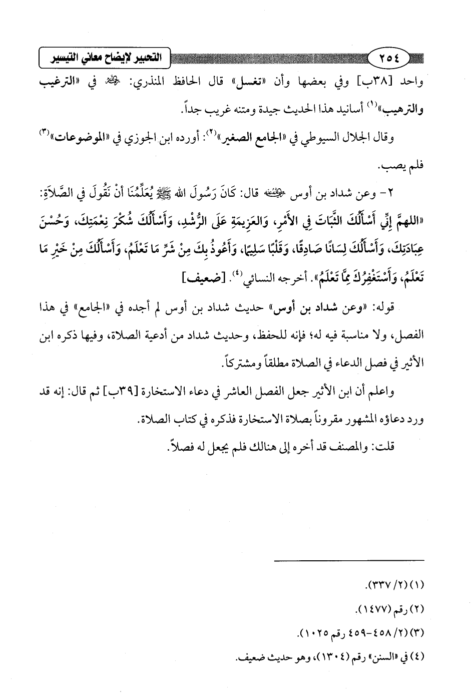 2 - وعن شداد بن أوس - رضي الله عنه - قال: كَانَ رَسُولَ الله - صلى الله عليه وسلم - يُعَلِّمُنَا أنْ نَقُولَ في الصَّلاَةِ: "اللهمَّ إِنِّي أَسْأَلُكَ الثَّبَاتَ فِي الأَمْرِ، وَالعَزِيمَةِ عَلَى الرُّشْدِ، وَأَسْأَلُكَ شُكْرَ نِعْمَتِكَ، وَحُسْنَ عِبَادَتِكَ، وَأَسْأَلُكَ لِسَانًا صَادِقًا، وَقَلْبًا سَلِيمًا، وَأَعُوذُ بِكَ مِنْ شَرِّ مَا تَعْلَمُ، وَأَسْأَلُكَ مِنْ خَيْرِ مَا تَعْلَمُ، وَأَسْتَغْفِرُكَ مِمَّا تَعْلَمُ". أخرجه النسائي (¬4). [ضعيف]