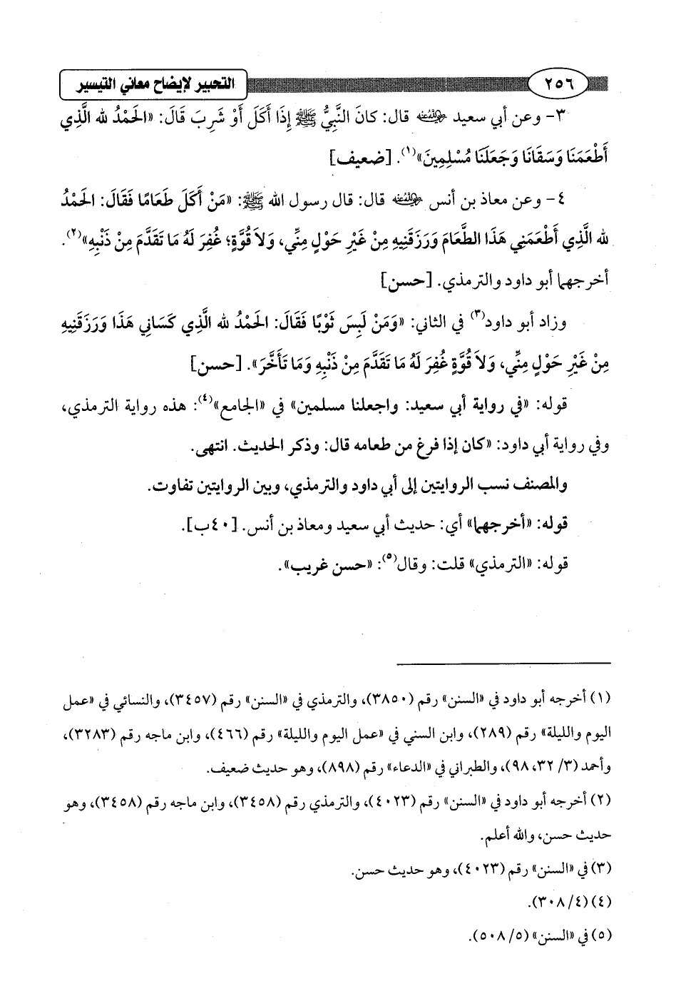 4 - وعن معاذ بن أنس - رضي الله عنه - قال: قال رسول الله - صلى الله عليه وسلم -: "مَنْ أَكَلَ طَعَامًا فَقَالَ: الحَمْدُ لله الَّذِي أَطْعَمَنِي هَذَا الطَّعَامَ وَرَزَقَنِيهِ مِنْ غَيْرِ حَوْلٍ مِنِّي، وَلاَ قُوَّةٍ؛ غُفِرَ لَه مَا تَقَدَّمَ مِنْ ذَنْبِهِ" (¬2). أخرجهما أبو داود والترمذي. [حسن]