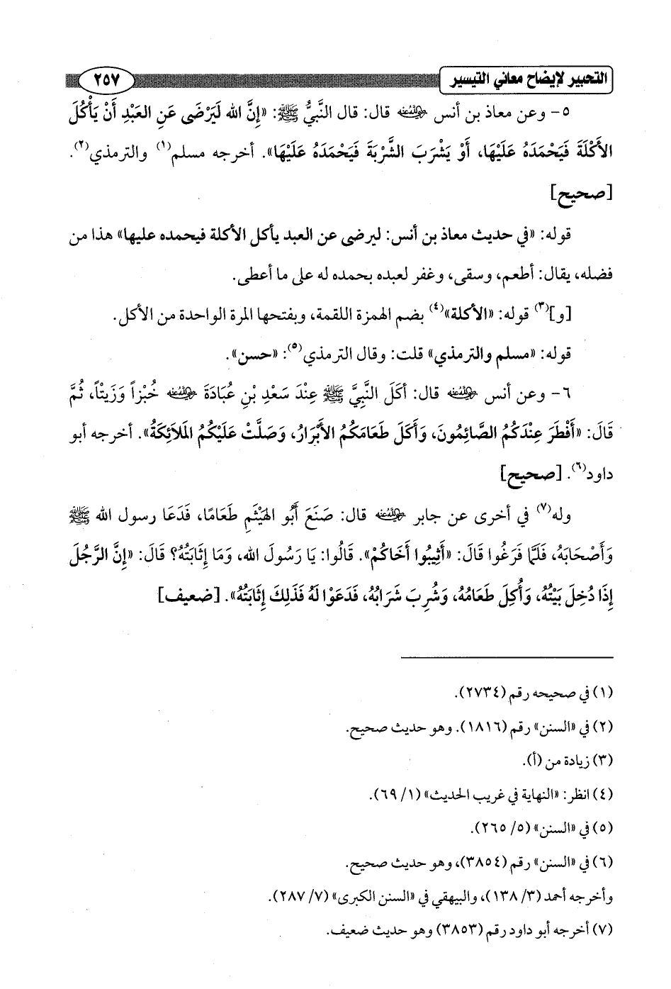 5 - وعن معاذ بن أنس - رضي الله عنه - قال: قال النَّبيُّ - صلى الله عليه وسلم -: "إِنَّ الله لَيَرْضَى عَنِ العَبْدِ أَنْ يَأْكُلَ الأَكْلَةَ فَيَحْمَدَهُ عَلَيْهَا، أَوْ يَشْرَبَ الشَّرْبَةَ فَيَحْمَدَهُ عَلَيْهَا". أخرجه مسلم (¬1) والترمذي (¬2). [صحيح]