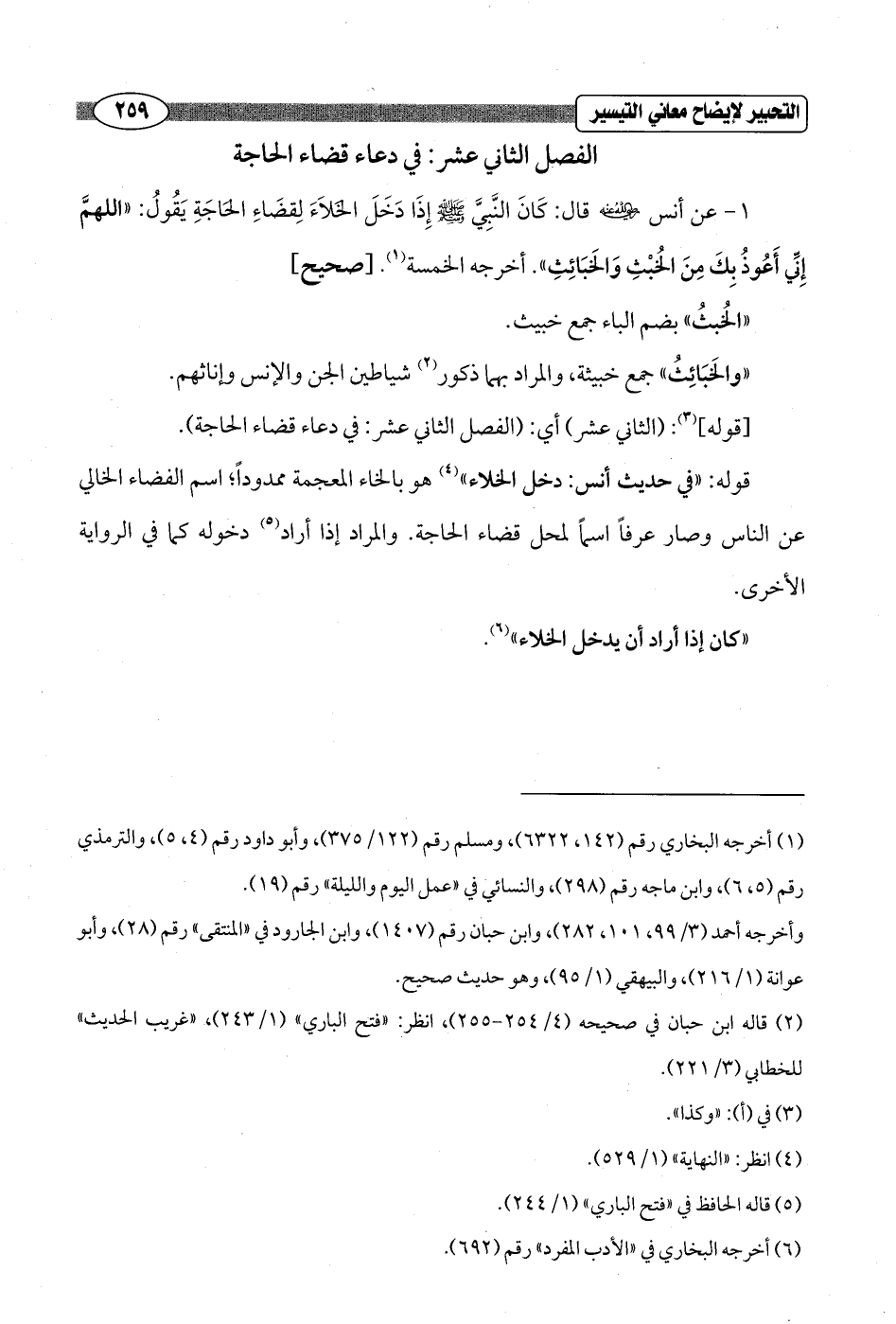 1 - عن أنس - رضي الله عنه - قال: كَانَ النَّبِيَّ - صلى الله عليه وسلم - إِذَا دَخَلَ الخَلاَءَ لِقضَاءِ الحاجَةِ يَقُولُ: "اللهمَّ إِنِّي أَعُوذُ بِكَ مِنَ الخُبْثِ وَالخَبَائِثِ". أخرجه الخمسة (¬1). [صحيح]