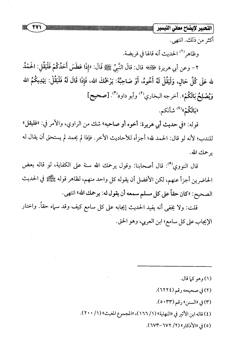 قال النووي (¬5): قال أصحابنا: وقول يرحمك الله سنة على الكفاية، لو قاله بعض الحاضرين أجزأ عنهم، لكن الأفضل أن يقوله كل واحد منهم، لظاهر قوله - صلى الله عليه وسلم - في الحديث الصحيح: "كان حقاً على كل مسلم سمعه أن يقول له: يرحمك الله" انتهى.