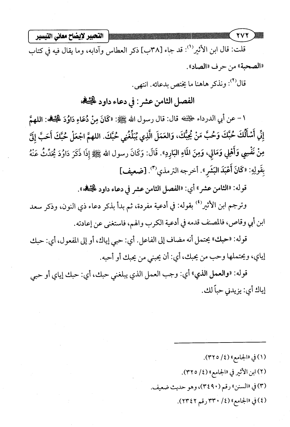1 - عن أبي الدرداء - رضي الله عنه - قال: قال رسول الله - صلى الله عليه وسلم -: "كَانَ مِنْ دُعَاءِ دَاوُدَ - عليه السلام -: اللهمَّ إِنِّي أَسْأَلُكَ حُبَّكَ وَحُبَّ مَنْ يُحبُّكَ، وَالعَمَلَ الَّذِي يُبَلِّغُنِي حُبَّكَ. اللهمَّ اجْعَلْ حُبَّكَ أَحَبَّ إِلَيَّ مِنْ نَفْسِي وَأَهْلِي وَمَالِي، وَمِنَ المَاءِ البَارِدِ". قَالَ: وَكَانَ رسول الله - صلى الله عليه وسلم - إِذَا ذَكَرَ دَاوُدَ يُحَدَّثُ عَنْهُ بِقَولِهِ: "كَانَ أَعْبَدَ البَشَرِ". أخرجه الترمذي (¬3). [ضعيف]