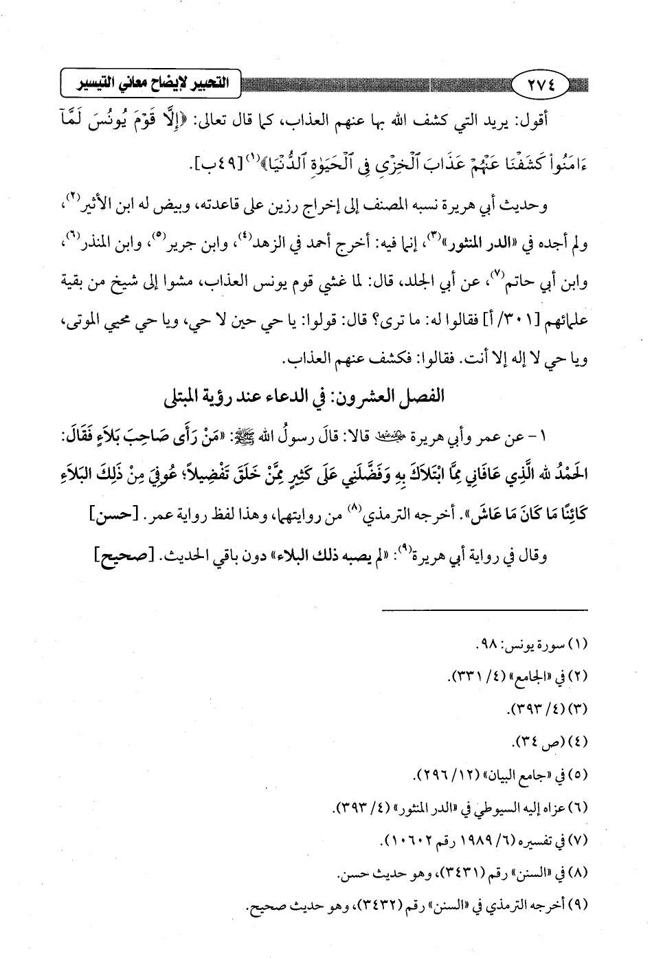 1 - عن عمر وأبي هريرة - رضي الله عنهما - قالا: قَالَ رسولُ الله - صلى الله عليه وسلم -: "مَنْ رَأَى صَاحِبَ بَلاَءٍ فَقَالَ: الحَمْدُ لله الَّذِي عَافَانِي مِمَّا ابْتَلاَكَ بِهِ وَفَضَّلَنِي عَلَى كثير مِمَّنْ خَلَقَ تَفْضِيلاً؛ عُوفِيَ مِنْ ذَلِكَ البَلاَءِ كَائِنًا مَا كَانَ مَا عَاشَ". أخرجه الترمذي (¬8) من روايتهما، وهذا لفظ رواية عمر. [حسن]