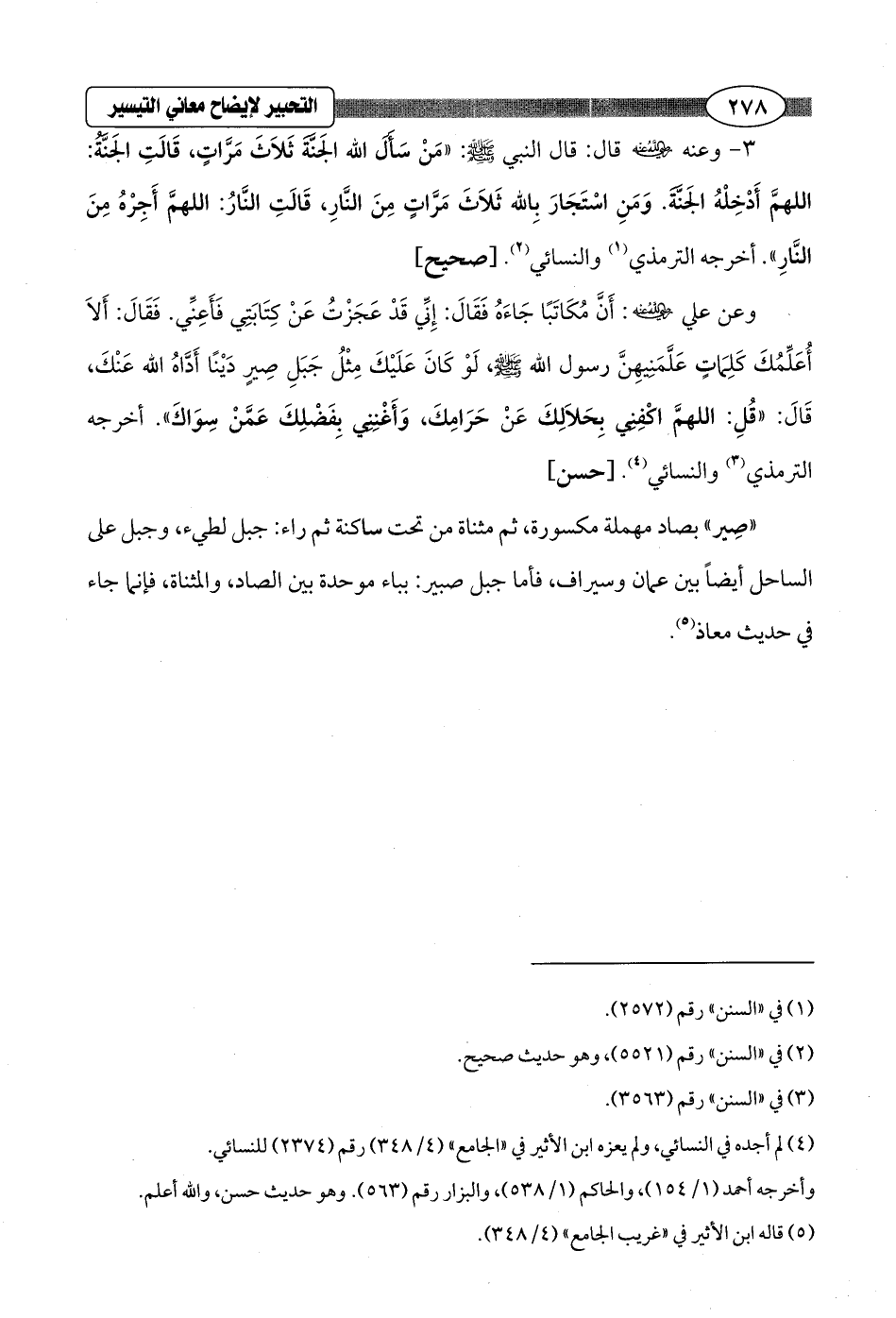 وعن علي - رضي الله عنه -: أَنَّ مُكَاتَبًا جَاءَهُ فَقَالَ: إِنِّي قَدْ عَجَزْتُ عَنْ كِتَابَتِي فَأَعِنِّي. فَقَالَ: أَلاَ أُعَلِّمُكَ كَلِمَاتٍ عَلَّمَنِيهِنَّ رسول الله - صلى الله عليه وسلم -، لَوْ كَانَ عَلَيْكَ مِثْلُ جَبَلِ صِيرٍ دَيْنًا أَدَّاهُ الله عَنْكَ، قَالَ: "قُلِ: اللهمَّ اكْفِني بِحَلاَلِكَ عَنْ حَرَامِكَ، وَأَغْنِني بِفَضْلِكَ عَمَّنْ سِوَاكَ". أخرجه الترمذي (¬3) والنسائي (¬4). [حسن]