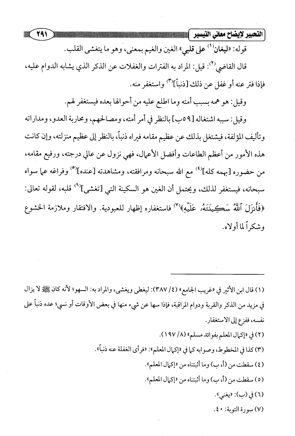 وقيل: سببه اشتغاله [59 ب] بالنظر في أمر أمته، ومصالحهم، ومحاربة العدو، ومداراته وتأليف المؤلفة، فيشتغل بذلك عن عظيم مقامه فيراه ذنباً، بالنظر إلى عظيم منزلته، وإن كانت هذه الأمور من أعظم الطاعات وأفضل الأعمال، فهي نزول عن عالي درجته، ورفيع مقامه، من حضوره [بهمه كله] (¬4) مع الله سبحانه ومرافقته، ومشاهدته [عنده] (¬5) وفراغه عما سواه سبحانه، فيستغفر لذلك، ويحتمل أن الغين هو السكينة التي [تغشى] (¬6) قلبه، لقوله تعالى: {فَأَنْزَلَ اللَّهُ سَكِينَتَهُ عَلَيْهِ} (¬7) فاستغفاره إظهار للعبودية. والافتقار وملازمة الخشوع وشكراً لما أولاه.