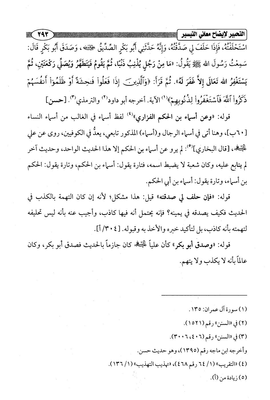 اسْتَحْلَفْتُهُ، فَإِذَا حَلَفَ لِي صَدَّقْتُهُ، وَإِنَّهُ حَدَّثَنِي أَبُو بَكْرٍ الصِّدِّيقُ - رضي الله عنه -، وَصَدَقَ أَبُو بَكْرٍ قَالَ: سَمِعْتُ رَسُولَ الله - صلى الله عليه وسلم - يَقُولُ: "مَا مِنْ رَجُلٍ يُذْنِبُ ذنْبًا، ثُمَّ يَقُومُ فَيَتَطَهَّرُ وَيُصَلِّي رَكعَتَيْنِ، ثُمَّ يَسْتَغْفِرُ الله تَعَالَى إِلاَّ غَفَرَ لَهُ". ثُمَّ قَرَأَ: {وَالَّذِينَ إِذَا فَعَلُوا فَاحِشَةً أَوْ ظَلَمُوا أَنْفُسَهُمْ ذَكَرُوا اللَّهَ فَاسْتَغْفَرُوا لِذُنُوبِهِمْ} (¬1) الآية. أخرجه أبو داود (¬2) والترمذي (¬3). [حسن]