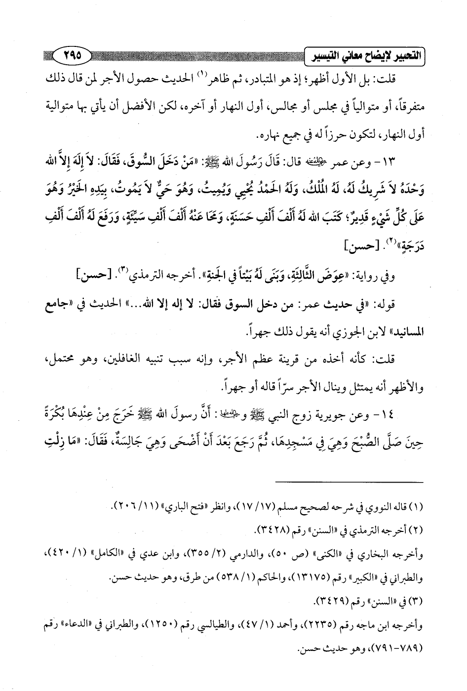 13 - وعن عمر - رضي الله عنه - قال: قَالَ رَسُولَ الله - صلى الله عليه وسلم -: "مَنْ دَخَلَ السُّوقَ، فَقَالَ: لاَ إِلَهَ إِلاَّ الله وَحْدَهُ لاَ شَرِيكُ لَهُ، لَهُ المُلْكُ، وَلَهُ الحَمْدُ يُحْيِي وَيُمِيتُ، وَهُوَ حَيٌّ لاَ يَمُوتُ، بِيَدهِ الَخْيرُ وَهُوَ عَلَى كلِّ شَيْءٍ قَدِيرٌ؛ كَتَبَ الله لَهُ أَلْفَ أَلْفِ حَسَنةٍ, وَمَحَا عَنْهُ أَلْفَ أَلْفِ سَيِّئَةٍ, وَرَفَعَ لَهُ أَلْفَ أَلْفِ دَرَجَةٍ" (¬2). [حسن]