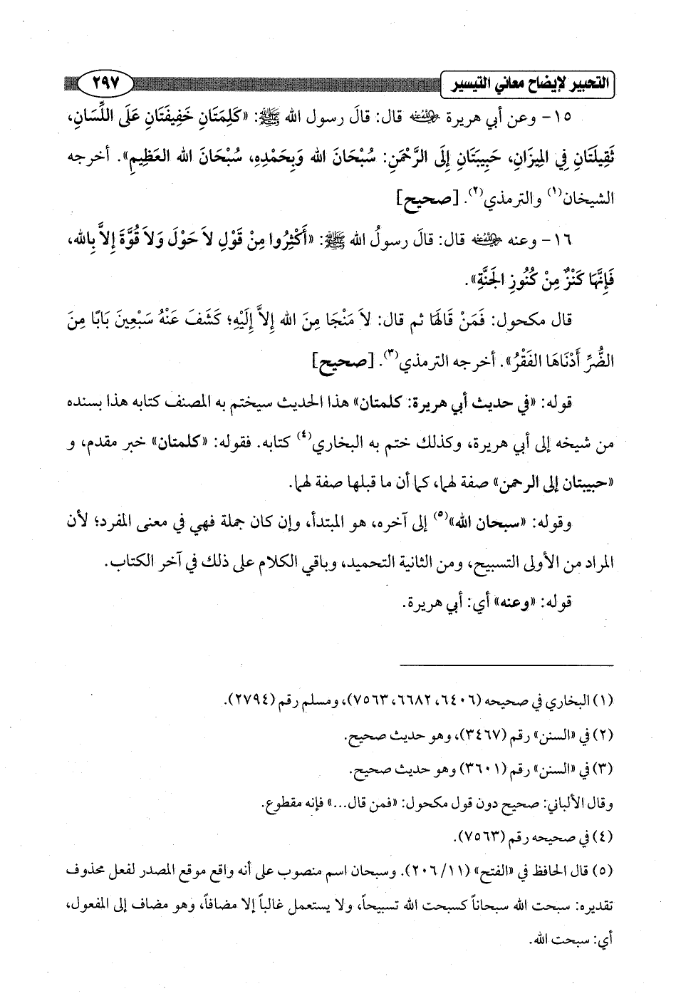 15 - وعن أبي هريرة - رضي الله عنه - قال: قَالَ رسول الله - صلى الله عليه وسلم -: "كَلِمَتَانِ خَفِيفَتَانِ عَلَى اللِّسَانِ، ثَقِيلَتَانِ فِي المِيزَانِ، حَبِيبَتَانِ إِلَى الرَّحْمَنِ: سُبْحَانَ الله وَبِحَمْدِهِ، سُبْحَانَ الله العَظِيمِ". أخرجه الشيخان (¬1) والترمذي (¬2). [صحيح]