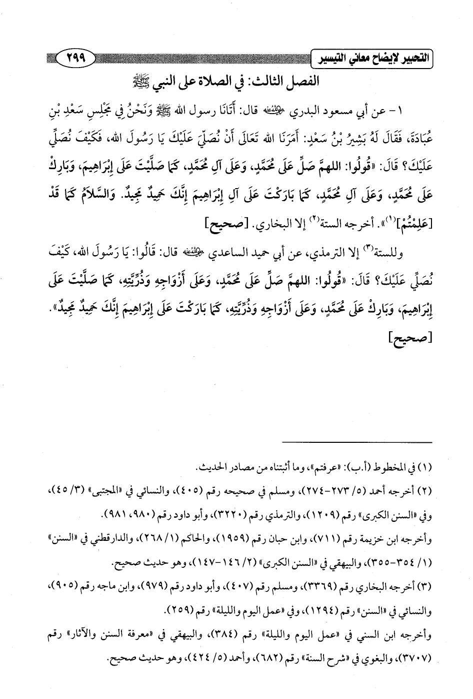 1 - عن أبي مسعود البدري - رضي الله عنه - قال: أَتَانَا رسول الله - صلى الله عليه وسلم - وَنَحْنُ فِي مَجْلِسِ سَعْدِ بْنِ عُبَادةَ، فَقَالَ لَهُ بَشِيرُ بْنُ سَعْدٍ: أَمَرَنَا الله تَعَالَى أَنْ نُصَلّيَ عَلَيْكَ يَا رَسُولَ الله، فكَيْفَ نُصَلِّي عَلَيْكَ؟ قَالَ: "قُولُوا: اللهمَّ صَلِّ عَلَى مُحَمَّدٍ، وَعَلَى آلِ مُحَمَّدٍ، كَمَا صَلَّيْتَ عَلَى إِبْرَاهِيمَ، وَبَارِكْ عَلَى مُحَمَّدٍ، وَعَلَى آلِ مُحَمَّدٍ، كَمَا بَارَكتَ عَلَى آلِ إِبْرَاهِيمَ إِنَّكَ حَمِيدٌ مَجِيدٌ. وَالسَّلاَمُ كَمَا قَدْ [عَلِمْتُمْ] (¬1) ". أخرجه الستة (¬2) إلا البخاري. [صحيح]