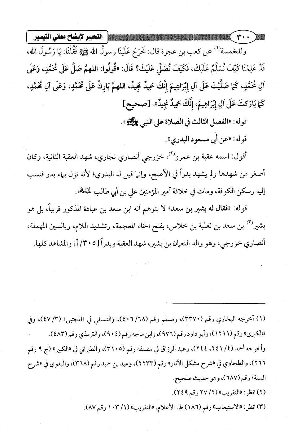 أقول: اسمه عقبة بن عمرو (¬2)، خزرجي أنصاري نجاري، شهد العقبة الثانية، وكان أصغر من شهدها ولم يشهد بدراً في الأصح، وإنما قيل له البدري؛ لأنه نزل بماء بدر فنسب إليه وسكن الكوفة، ومات في خلافة أمير المؤمنين علي بن أبي طالب - عليه السلام -.