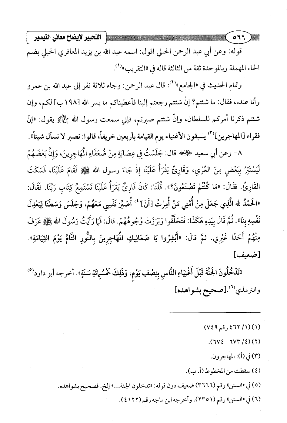 "تَدْخُلُونَ الجَنَّةَ قَبْلَ أَغْنِيَاءِ النَّاسِ بِنِصْفِ يَوْمٍ، وَذَلِكَ خَمْسُمِائَةِ سَنةٍ". أخرجه أبو داود (¬5) والترمذي (¬6). [صحيح بشواهده]