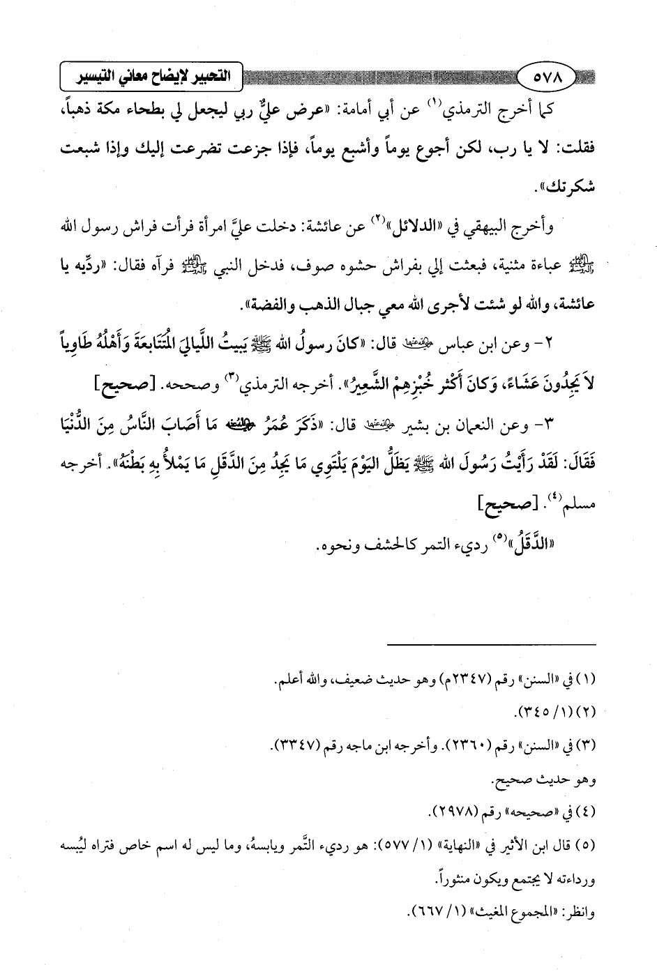 3 - وعن النعمان بن بشير - رضي الله عنهما - قال: "ذكَرَ عُمَرُ - رضي الله عنه - مَا أَصَابَ النَّاسُ مِنَ الدُّنْيَا فَقَالَ: لَقَدْ رَأَيْتُ رَسُولَ الله - صلى الله عليه وسلم - يَظَلُّ اليَوْمَ يَلْتَوِي مَا يَجِدُ مِنَ الدَّقَلِ مَا يَمْلأُ بِهِ بَطْنَهُ". أخرجه مسلم (¬4). [صحيح]