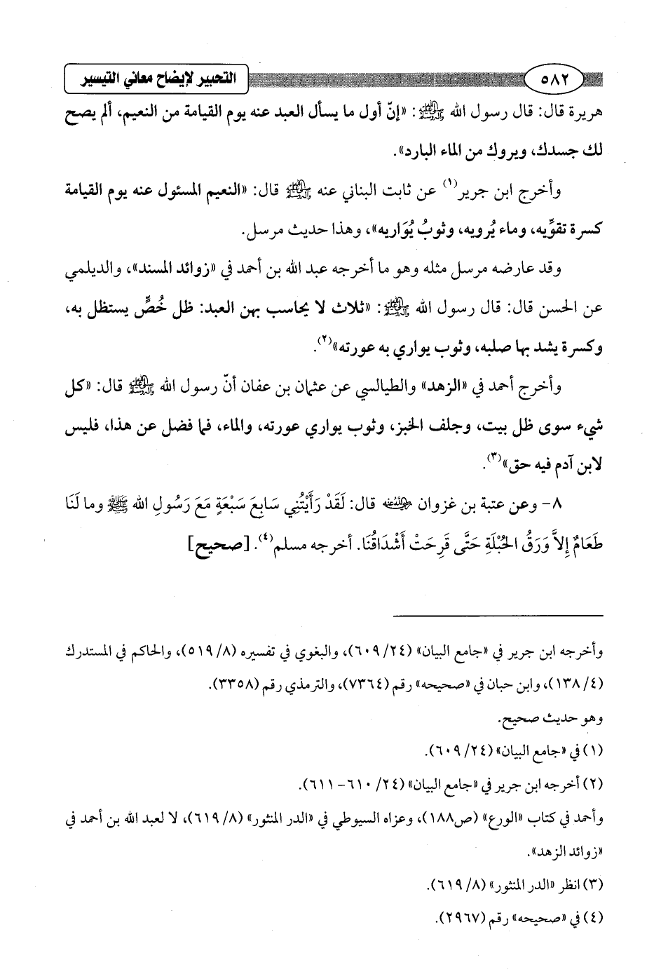 وأخرج ابن جرير (¬1) عن ثابت البناني عنه - صلى الله عليه وسلم - قال: "النعيم المسئول عنه يوم القيامة كسرة تقوِّيه, وماء يُرويه, وثوبُ يُوَاريه"، وهذا حديث مرسل.