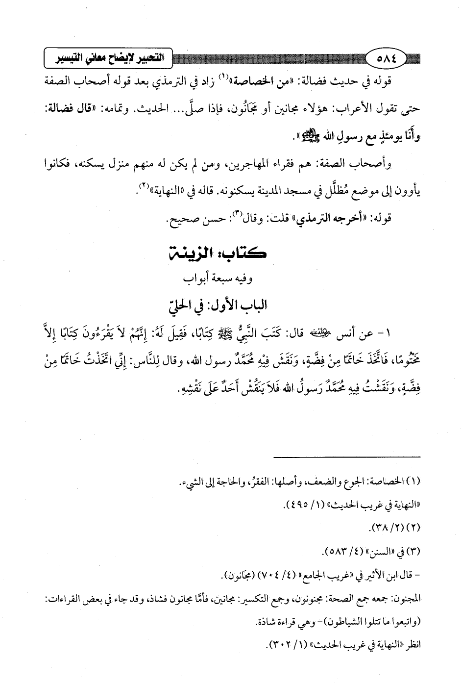 قوله في حديث فضالة: "من الخصاصة" (¬1) زاد في الترمذي بعد قوله أصحاب الصفة حتى تقول الأعراب: هؤلاء مجانين أو مَجَانُون، فإذا صلَّى ... الحديث. وتمامه: "قال فضالة: وأَنَا يومئذٍ مع رسولِ الله - صلى الله عليه وسلم - ".