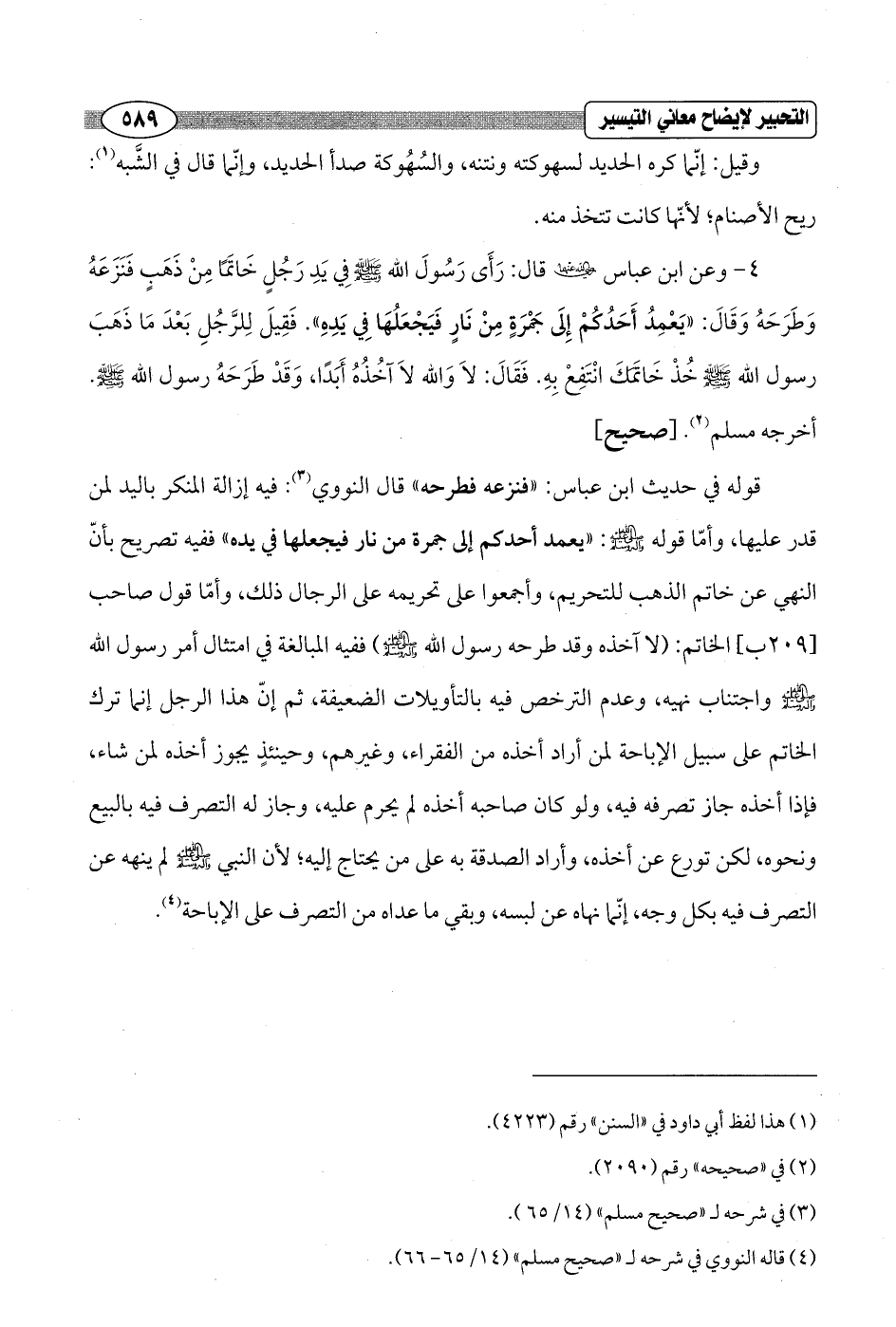 قوله في حديث ابن عباس: "فنزعه فطرحه" قال النووي (¬3): فيه إزالة المنكر باليد لمن قدر عليها، وأمّا قوله - صلى الله عليه وسلم -: "يعمد أحدكم إلى جمرة من نار فيجعلها في يده" ففيه تصريح بأنّ النهي عن خاتم الذهب للتحريم، وأجمعوا على تحريمه على الرجال ذلك، وأمّا قول صاحب [209 ب] الخاتم: (لا آخذه وقد طرحه رسول الله - صلى الله عليه وسلم -) ففيه المبالغة في امتثال أمر رسول الله - صلى الله عليه وسلم - واجتناب نهيه، وعدم الترخص فيه بالتأويلات الضعيفة، ثم إنّ هذا الرجل إنما ترك الخاتم على سبيل الإباحة لمن أراد أخذه من الفقراء، وغيرهم، وحينئذٍ يجوز أخذه لمن شاء، فإذا أخذه جاز تصرفه فيه، ولو كان صاحبه أخذه لم يحرم عليه، وجاز له التصرف فيه بالبيع ونحوه، لكن تورع عن أخذه، وأراد الصدقة به على من يحتاج إليه؛ لأن النبي - صلى الله عليه وسلم - لم ينهه عن التصرف فيه بكل وجه، إنّما نهاه عن لبسه، وبقي ما عداه من التصرف على الإباحة (¬4).