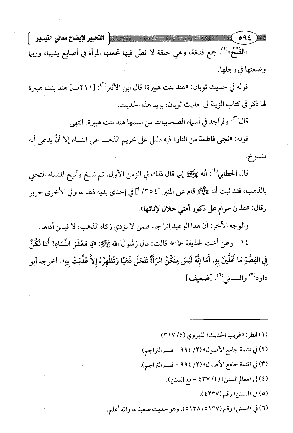 14 - وعن أخت لحذيفة - رضي الله عنها - قالت: قال رَسُولَ الله - صلى الله عليه وسلم -: "يَا مَعْشَرَ النِّسَاءِ! أَمَا لَكُنَّ فِي الفِضَّةِ مَا تَحَلَّيْنَ بِه، أَمَا إِنَّهُ لَيْسَ مِنْكُنَّ امْرَأةٌ تتَحَلّى ذَهَبًا وَتُظْهِرُهُ إِلاَّ عُذِّبَتْ بِهِ". أخرجه أبو داود (¬5) والنسائي (¬6). [ضعيف]