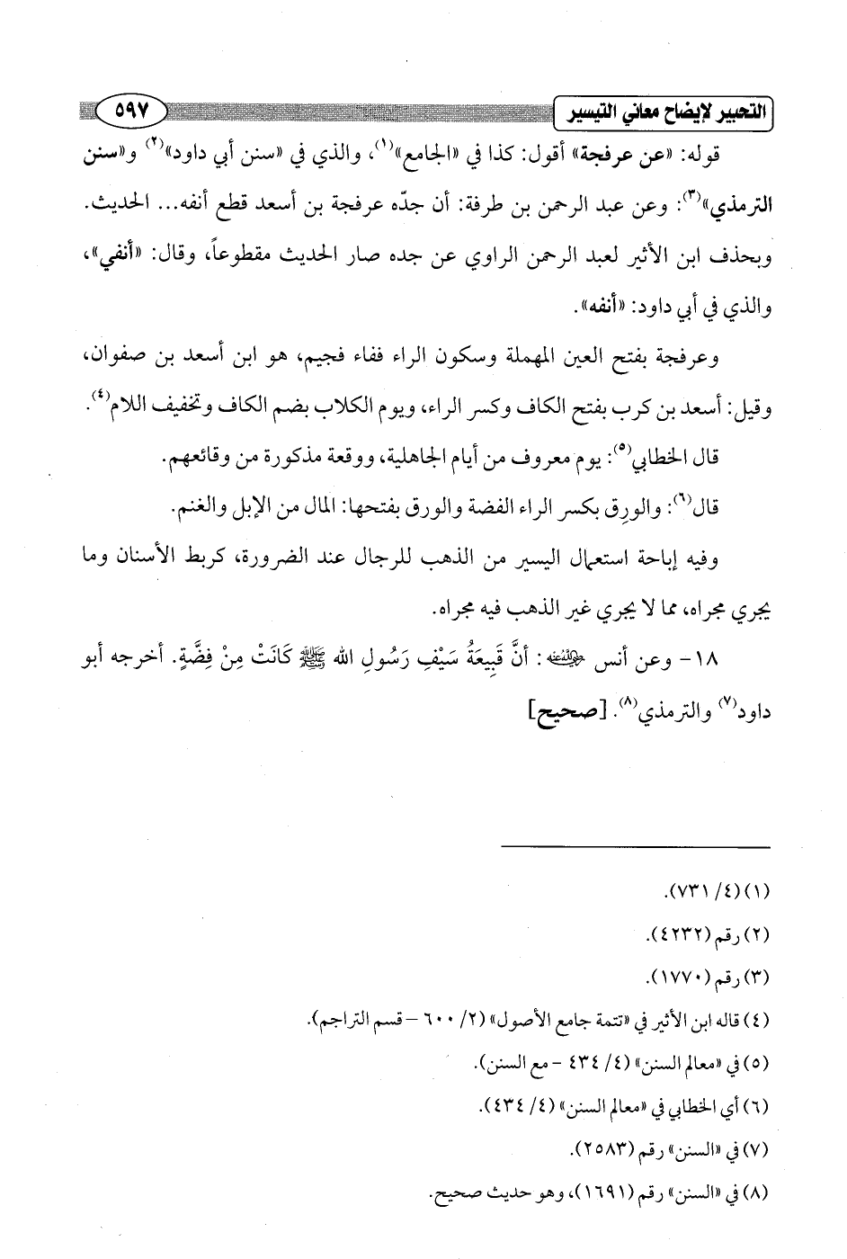قوله: "عن عرفجة" أقول: كذا في "الجامع" (¬1)، والذي في "سنن أبي داود" (¬2) و"سنن الترمذي" (¬3): وعن عبد الرحمن بن طرفة: أن جدّه عرفجة بن أسعد قطع أنفه ... الحديث. وبحذف ابن الأثير لعبد الرحمن الراوي عن جده صار الحديث مقطوعاً، وقال: "أنفي"، والذي في أبي داود: "أنفه".