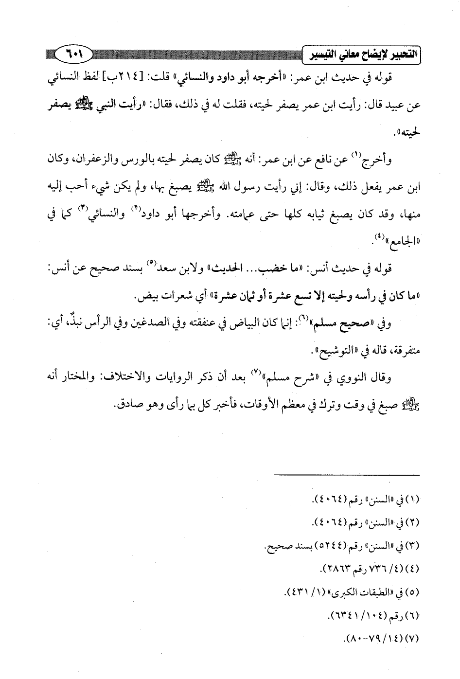 قوله في حديث ابن عمر: "أخرجه أبو داود والنسائي" قلت: [214 ب] لفظ النسائي عن عبيد قال: رأيت ابن عمر يصفر لحيته، فقلت له في ذلك، فقال: "رأيت النبي - صلى الله عليه وسلم - يصفر لحيته".