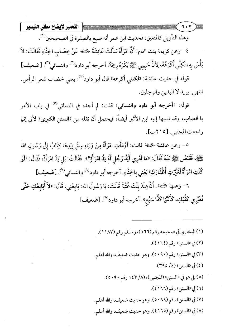 5 - وعن عائشة - رضي الله عنها - قالت: أَوْمَأَتِ امْرَأَةٌ مِنْ وَرَاءِ سِتْرٍ بِيَدِهَا كِتَابٌ إِلَى رَسُولِ اللَّه - صلى الله عليه وسلم - فَقَبَضَ - صلى الله عليه وسلم - يَدَهُ فَقَالَ: "مَا أَدْرِي أَيَد رَجُلٍ أَمْ يَدُ امْرَأَةٍ؟ ". فَقَالَتْ: بَلِ يَدُ امْرَأَةٌ، فَقَالَ: "لَوْ كنْتِ امْرَأةً لَغَيَّرْتِ أَظْفَارَكِ" يَعْنِي بِالحِنَّاءِ. أخرجه أبو داود (¬6) والنسائي (¬7). [ضعيف]