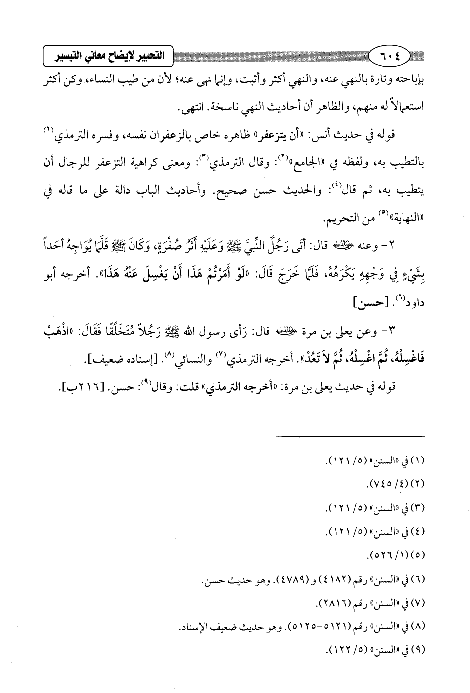 3 - وعن يعلى بن مرة - رضي الله عنه - قال: رَأى رسول الله - صلى الله عليه وسلم - رَجُلًا مُتَخَلِّقًا فَقَالَ: "اذْهَبْ فَاغْسِلْهُ، ثُمَّ اغْسِلْهُ, ثُمَّ لاَ تَعُدْ". أخرجه الترمذي (¬7) والنسائي (¬8). [إسناده ضعيف].