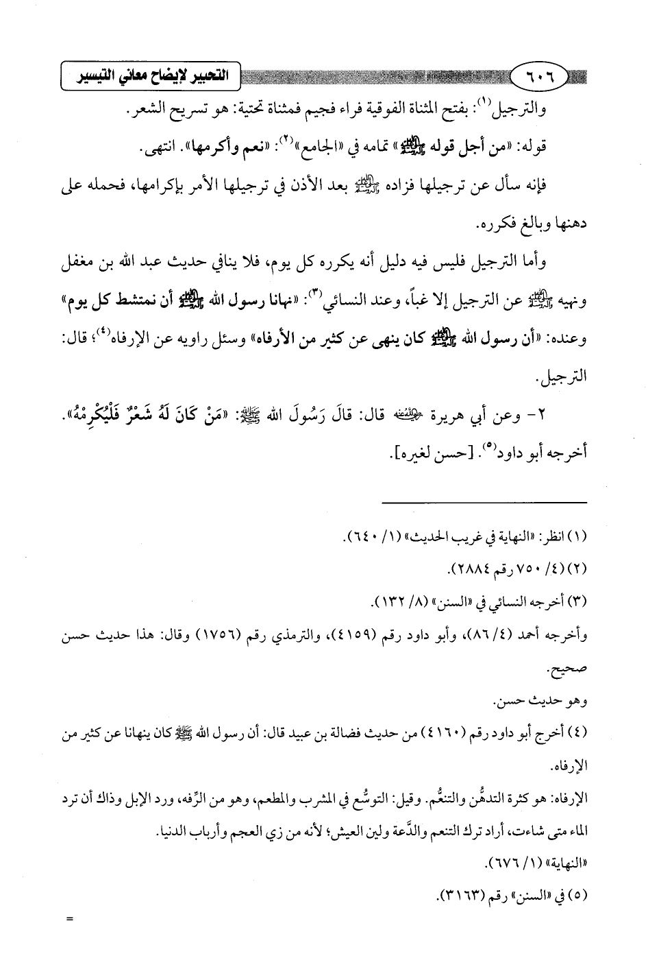 وأما الترجيل فليس فيه دليل أنه يكرره كل يوم، فلا ينافي حديث عبد الله بن مغفل ونهيه - صلى الله عليه وسلم - عن الترجيل إلا غبًا، وعند النسائي (¬3): "نهانا رسول الله - صلى الله عليه وسلم - أن نمتشط كل يوم" وعنده: "أن رسول الله - صلى الله عليه وسلم - كان ينهى عن كثير من الأرفاه" وسئل راويه عن الإرفاه (¬4)؛ قال: الترجيل.