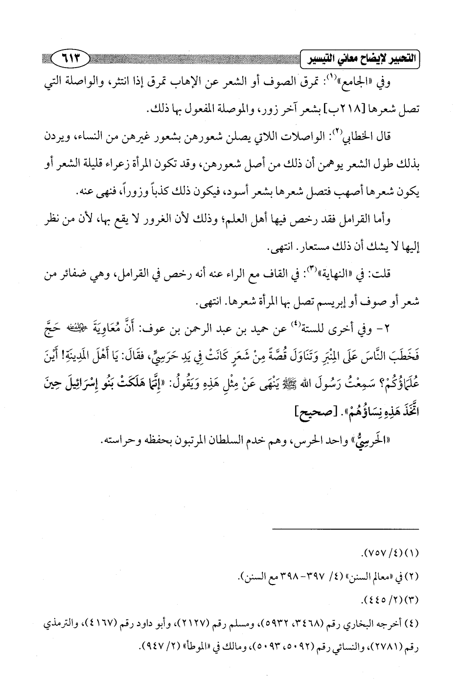 2 - وفي أخرى للستة (¬4) عن حميد بن عبد الرحمن بن عوف: أَنَّ مُعَاوِيَةَ - رضي الله عنه - حَجَّ فَخَطَبَ النَّاسَ عَلَى المِنْبَرِ وَتَنَاوَلَ قُصَّةً مِنْ شَعَرٍ كَانَتْ فِي يَدِ حَرَسِيٍّ، فقَالَ: يَا أَهْلَ المَدِينَةِ! أَيْنَ عُلَمَاؤُكُمْ؟ سَمِعْتُ رَسُولَ الله - صلى الله عليه وسلم - يَنْهَى عَنْ مِثْلِ هَذِهِ وَيَقُولُ: "إِنَّمَا هَلَكَتْ بَنُو إِسْرَائِيلَ حِينَ اتَّخَذَ هَذِهِ نِسَاؤُهُمْ". [صحيح]