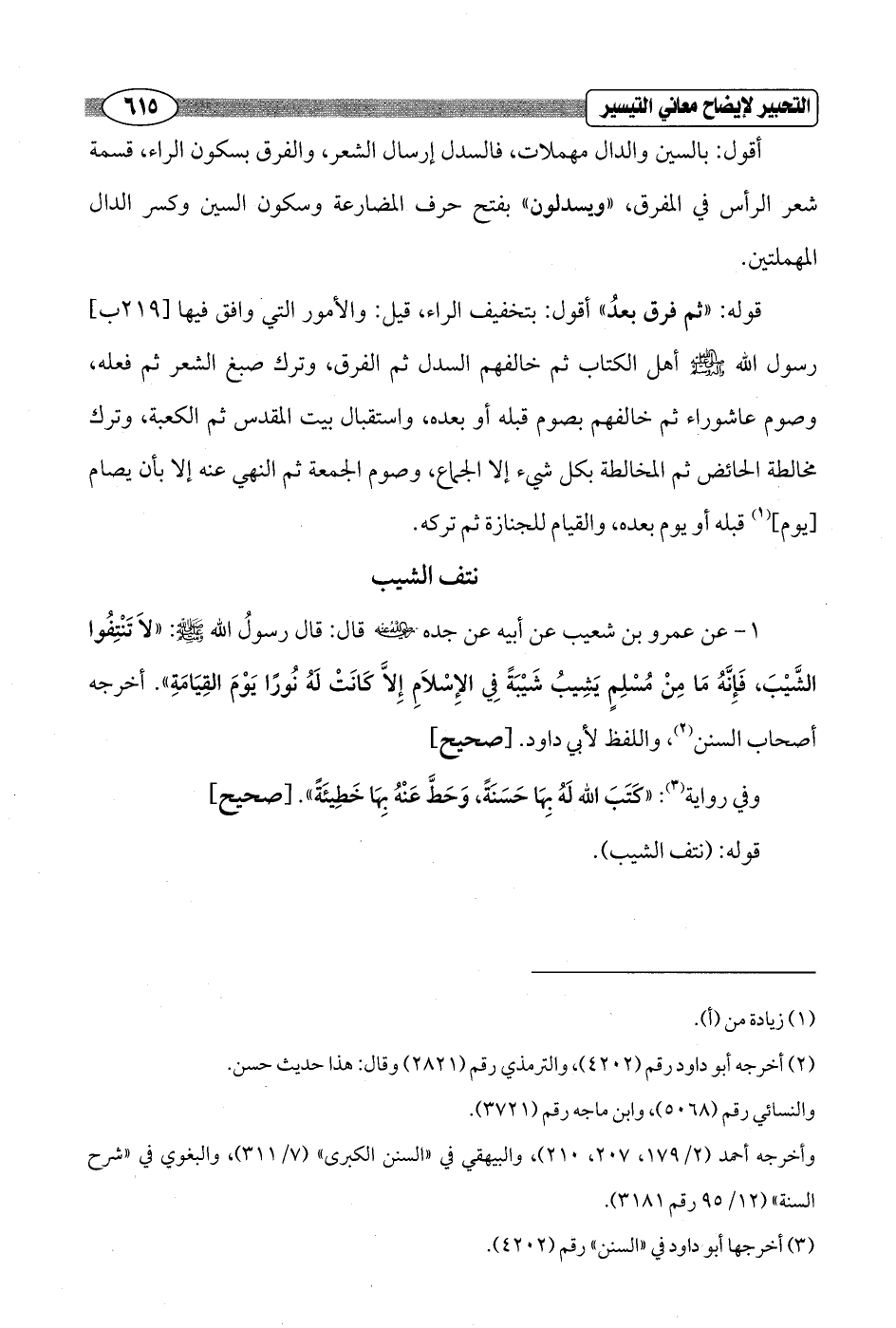 1 - عن عمرو بن شعيب عن أبيه عن جده - رضي الله عنه - قال: قال رسولُ الله - صلى الله عليه وسلم - "لاَ تَنْتِفُوا الشَّيْبَ، فَإِنَّهُ مَا مِنْ مُسْلِمٍ يَشِيبُ شَيْبَةً فِي الإِسْلاَمِ إِلاَّ كَانَتْ لَهُ نُورًا يَوْمَ القِيَامَةِ". أخرجه أصحاب السنن (¬2)، واللفظ لأبي داود. [صحيح]