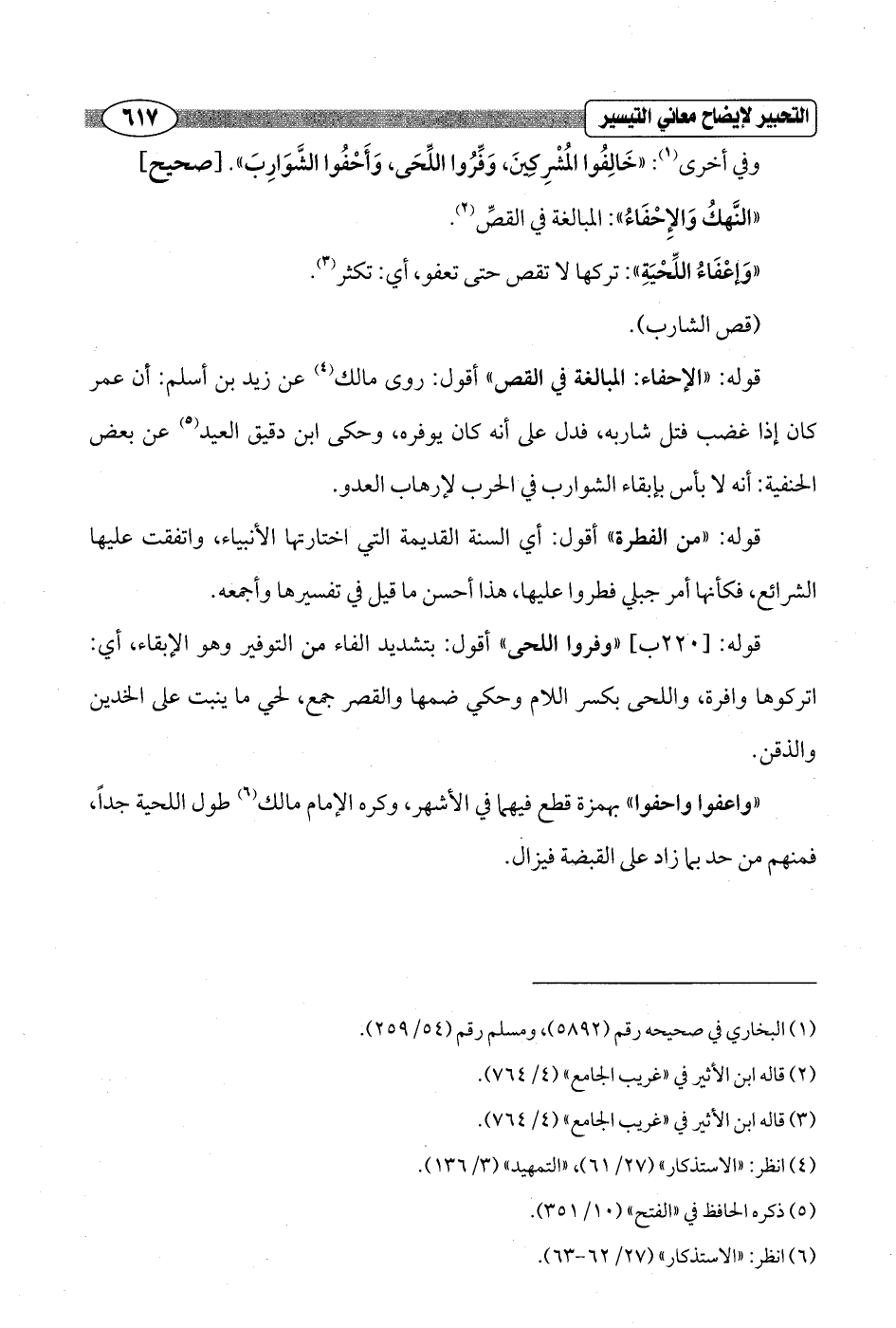 قوله: [220 ب] "وفروا اللحى" أقول: بتشديد الفاء من التوفير وهو الإبقاء، أي: اتركوها وافرة, واللحى بكسر اللام وحكي ضمها والقصر جمع، لحي ما ينبت على الخدين والذقن.