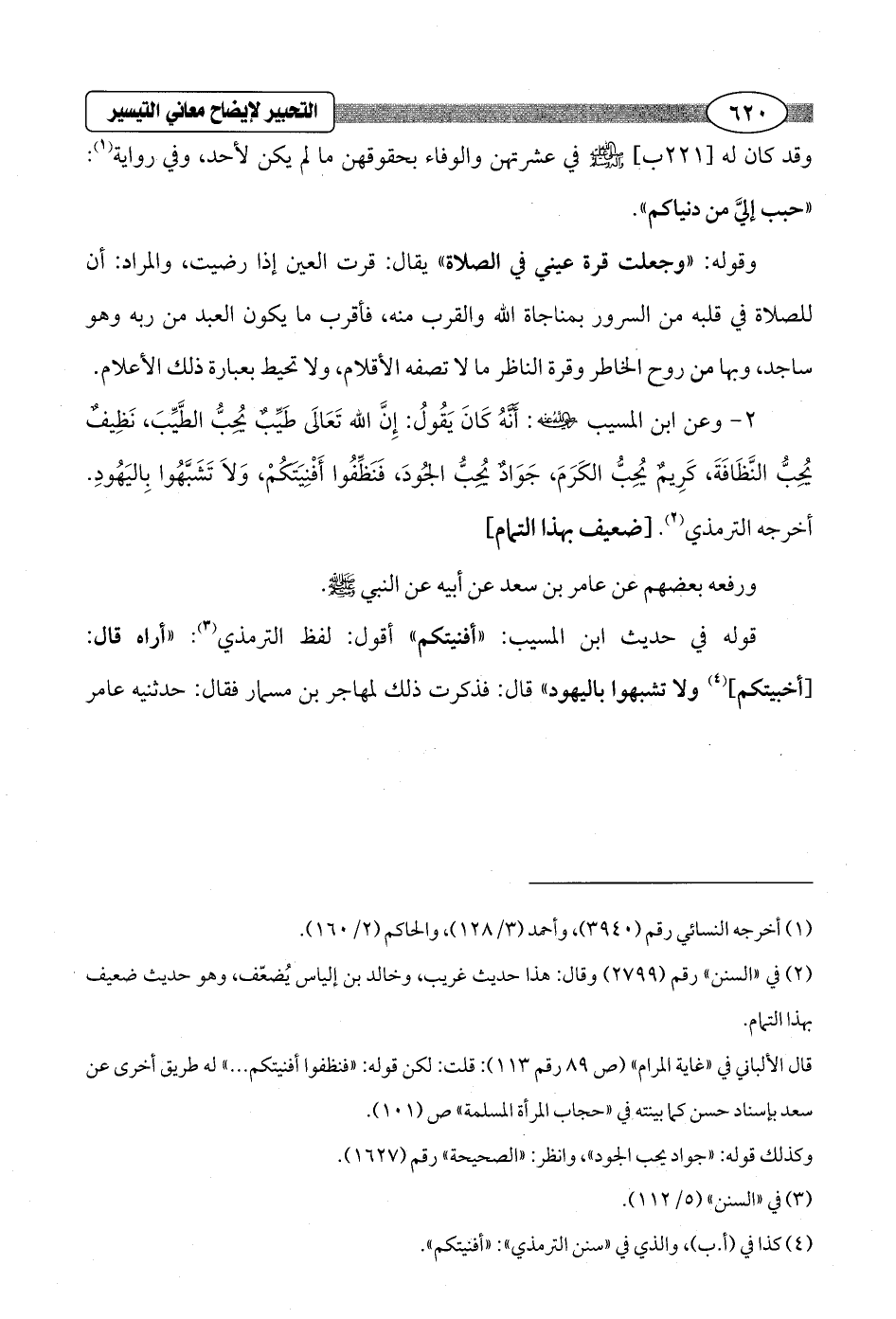 2 - وعن ابن المسيب - رضي الله عنه -: أَنَّهُ كَانَ يَقُولُ: إِنَّ الله تَعَالَى طَيِّبٌ يُحِبُّ الطَّيِّبَ، نَظِيفٌ يُحِبُّ النَّظَافَةَ، كَرِيمٌ يُحِبُّ الكَرَمَ، جَوَادٌ يُحِبُّ الجُودَ، فَنَظِّفُوا أَفْنِيَتَكُمْ، وَلاَ تَشَبَّهُوا بِاليَهُودِ. أخرجه الترمذي (¬2). [ضعيف بهذا التمام]