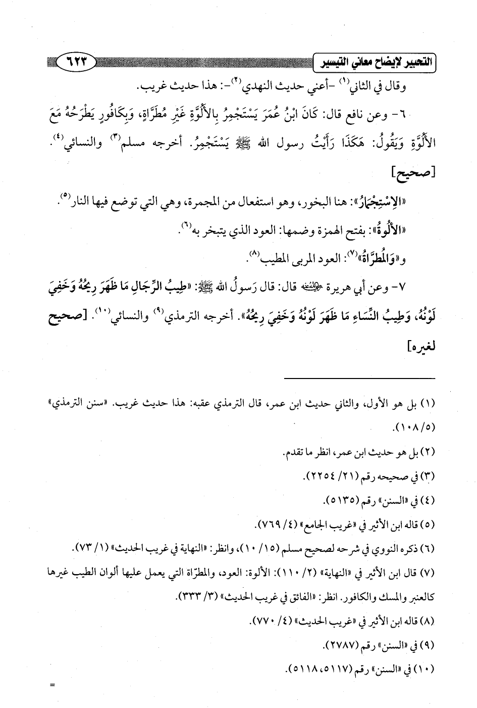 6 - وعن نافع قال: كَانَ ابْنُ عُمَرَ يَسْتَجْمِرُ بِالأَلُوَّةِ غَيْرِ مُطَرَّاةٍ، وَبِكَافُورٍ يَطْرَحُهُ مَعَ الأَلُوَّةِ وَيَقُولُ: هَكَذَا رَأَيْتُ رسول الله - صلى الله عليه وسلم - يَسْتَجْمِرُ. أخرجه مسلم (¬3) والنسائي (¬4). [صحيح]