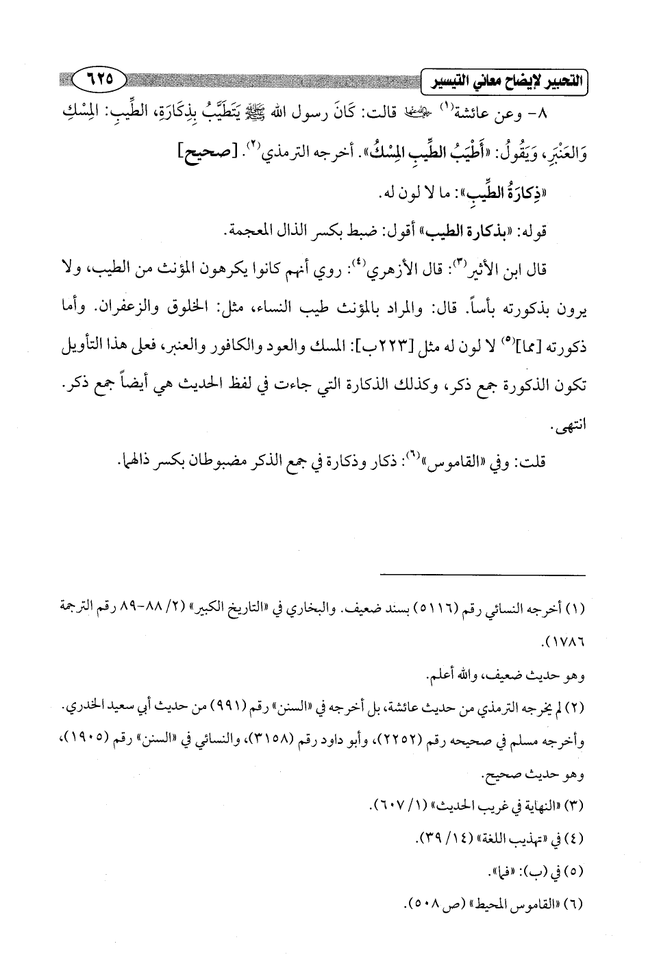 قال ابن الأثير (¬3): قال الأزهري (¬4): روي أنهم كانوا يكرهون المؤنث من الطيب، ولا يرون بذكورته بأساً. قال: والمراد بالمؤنث طيب النساء، مثل: الخلوق والزعفران. وأما ذكورته [مما] (¬5) لا لون له مثل [223 ب]: المسك والعود والكافور والعنبر، فعلى هذا التأويل تكون الذكورة جمع ذكر، وكذلك الذكارة التي جاءت في لفظ الحديث هي أيضاً جمع ذكر. انتهى.