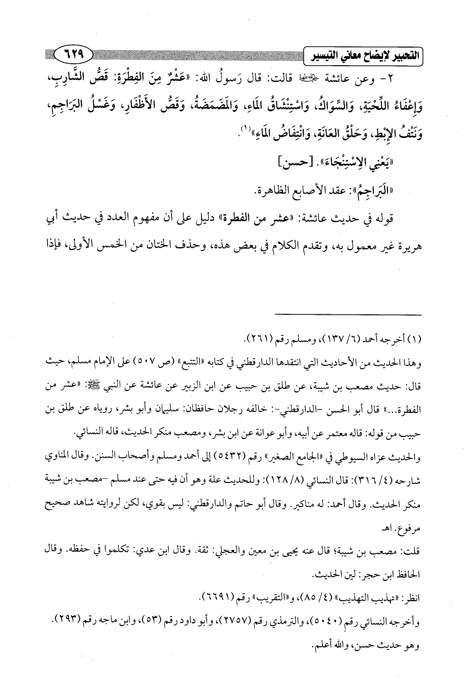وهذا الحديث من الأحاديث التي انتقدها الدارقطني في كتابه "التتبع" (ص 507) على الإمام مسلم، حيث قال: حديث مصعب بن شيبة، عن طلق بن حبيب عن ابن الزبير عن عائشة عن النبي - صلى الله عليه وسلم -: "عشر من الفطرة ... " قال أبو الحسن - الدارقطني -: خالفه رجلان حافظان: سليمان وأبو بشر، روياه عن طلق بن حبيب من قوله: قاله معتمر عن أبيه, وأبو عوانة عن ابن بشر، ومصعب منكر الحديث، قاله النسائي.