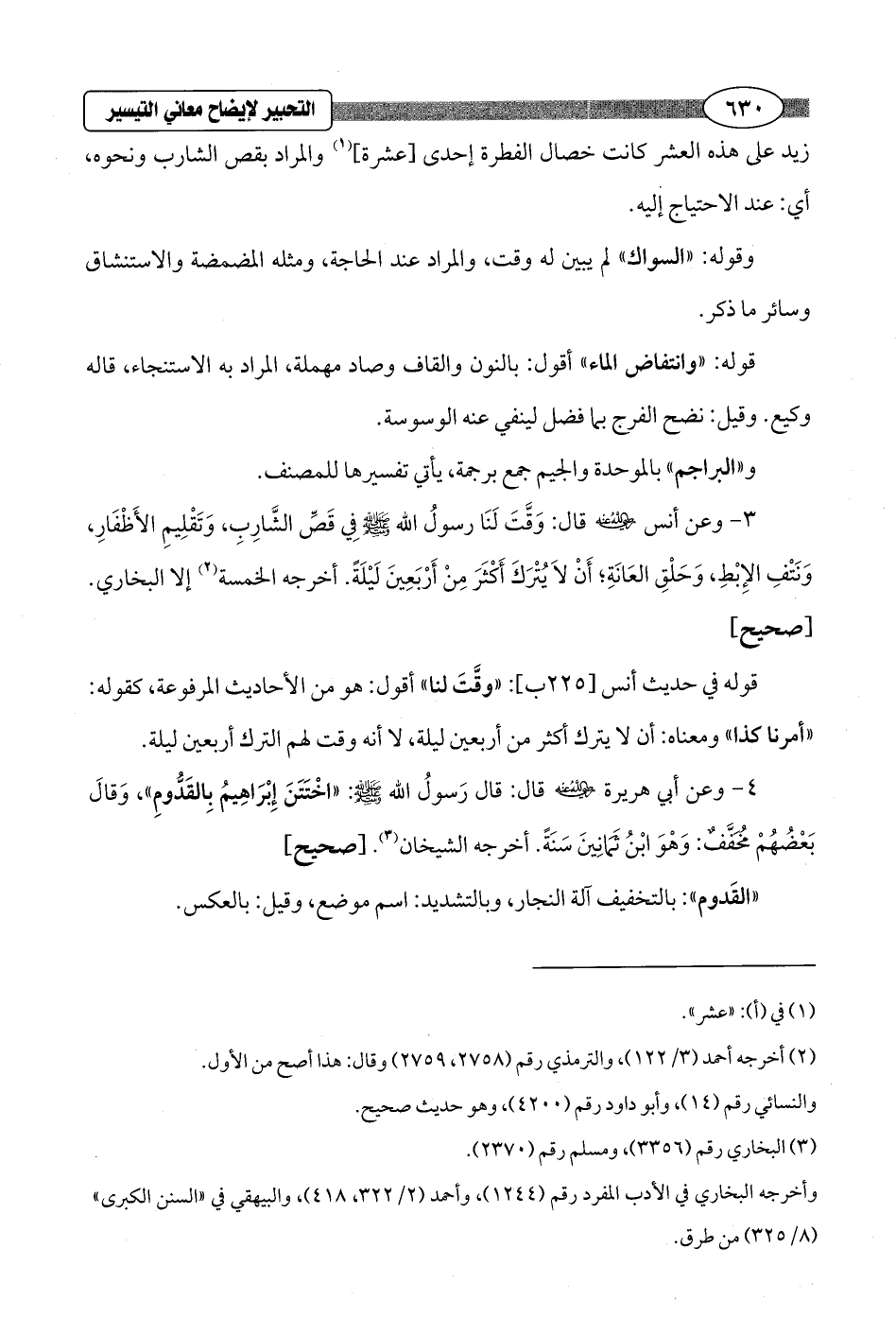 3 - وعن أنس - رضي الله عنه - قال: وَقَّتَ لَنَا رسولُ الله - صلى الله عليه وسلم - فِي قَصِّ الشَّارِبِ، وَتَقْلِيمِ الأَظْفَارِ، وَنَتْفِ الإِبْطِ، وَحَلْقِ العَانَةِ؛ أَنْ لاَ يُتْرَكَ أَكْثَرَ مِنْ أَرْبَعِينَ لَيْلَةً. أخرجه الخمسة (¬2) إلا البخاري. [صحيح]