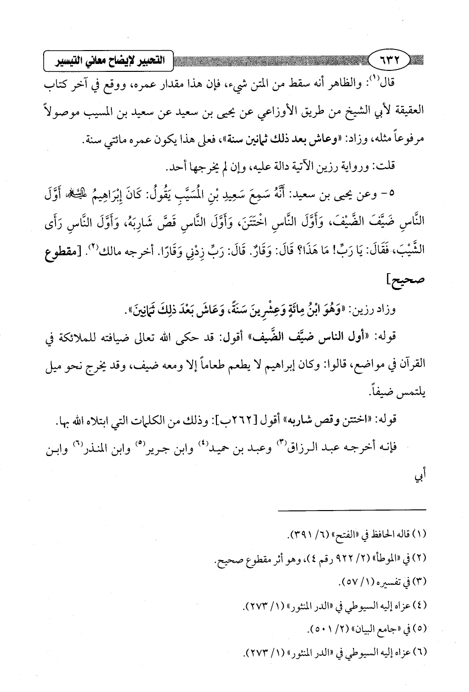 5 - وعن يحيى بن سعيد: أَنَّهُ سَمِعَ سَعِيدِ بْنِ المُسَيَّبِ يَقُولُ: كَانَ إِبْرَاهِيم - عليه السلام - أَوَّلَ النَّاسِ ضَيَّفَ الضَّيْفَ، وَأَوَّلَ النَّاسِ اخْتَتَنَ، وَأَوَّلَ النَّاسِ قَصَّ شَارِبَهُ، وَأَوَّلَ النَّاسِ رَأَى الشَّيْبَ، فَقَالَ: يَا رَبِّ! مَا هَذَا؟ قَالَ: وَقَارٌ. قَالَ: رَبِّ زِدْنِي وَقَارًا. أخرجه مالك (¬2). [مقطوع صحيح]