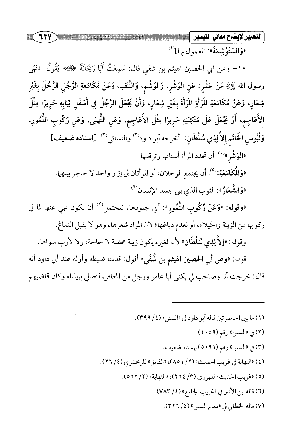 10 - وعن أبي الحصين الهيثم بن شفي قال: سَمِعْتُ أَبا رَيْحَانَةَ - رضي الله عنه - يَقُولُ: "نَهَى رسول الله - صلى الله عليه وسلم - عَنْ عَشْرٍ: عَنِ الوَشْرِ، وَالوَشْمِ، وَالنَّتْفِ، وَعَنْ مُكَامَعَةِ الرَّجُلِ الرَّجُلَ بِغيْرِ شِعَارٍ، وَعَنْ مُكَامَعَةِ المَرْأَةِ المَرْأَةَ بِغيرِ شِعَارٍ، وَأَنْ يَجْعَلَ الرَّجُلُ فِي أَسْفَلِ ثِيَابِهِ حَرِيرًا مِثْلَ الأَعَاجِمِ، أَوْ يَجْعَلَ عَلَى مَنْكِبَيْهِ حَرِيرًا مِثْلَ الأَعَاجِمِ، وَعَنِ النُّهْبَى، وَعَنِ رُكُوبِ النُّمُورِ، وَلُبُوسِ الخَاتَمِ إلَّا لِذِي سُلْطَانٍ". أخرجه أبو داود (¬2) والنسائي (¬3). [إسناده ضعيف]