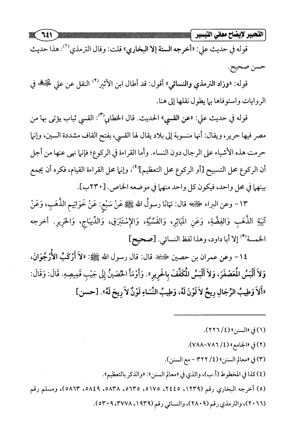 14 - وعن عمران بن حصين - رضي الله عنهما - قال: قال رسول الله - صلى الله عليه وسلم -: "لاَ أَركَبُ الأُرْجُوَانَ، وَلاَ أَلْبَسُ المُعَصْفَرَ، وَلاَ أَلْبَسُ المُكَفَّفَ بِالحَرِيرِ". وَأَوْمَأ الحُصَينُ إِلَى جَيْبِ قَمِيصِهِ. قَالَ: وَقَالَ: "أَلاَ وَطِيبُ الرِّجَالِ رِيحٌ لاَ لَوْنَ لَهُ، وَطِيبُ النِّسَاءِ لَوْنٌ لاَ رِيحَ لَهُ". [حسن]