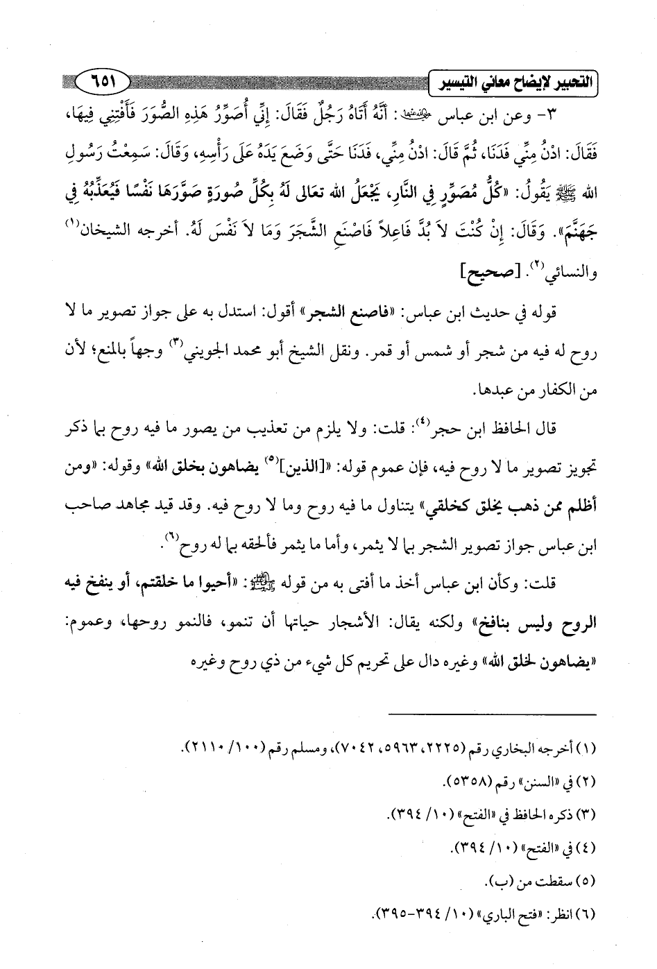 3 - وعن ابن عباس - رضي الله عنهما -: أنَّهُ أَتَاهُ رَجُلٌ فَقَالَ. إِنِّي أُصَوِّرُ هَذِهِ الصُّوَرَ فَأَفْتِنِي فِيهَا، فَقَالَ: ادْنُ مِنِّي فَدَنَا، ثُمَّ قَالَ: ادْنُ مِنِّي، فَدَنَا حَتَّى وَضَعَ يَدَهُ عَلَى رَأْسِهِ, وَقَالَ: سَمِعْتُ رَسُولِ الله - صلى الله عليه وسلم - يَقُولُ: "كُلُّ مُصَوِّرٍ فِي النَّارِ، يَجْعَلُ الله تعَالى لَهُ بِكُلِّ صُورَةٍ صَوَّرَهَا نَفْسًا فَيُعَذِّبُهُ فِي جَهَنَّمَ". وَقَالَ: إِنْ كُنْتَ لاَ بُدَّ فَاعِلًا فَاصْنَعِ الشَّجَرَ وَمَا لاَ نَفْسَ لَهُ. أخرجه الشيخان (¬1) والنسائي (¬2). [صحيح]
