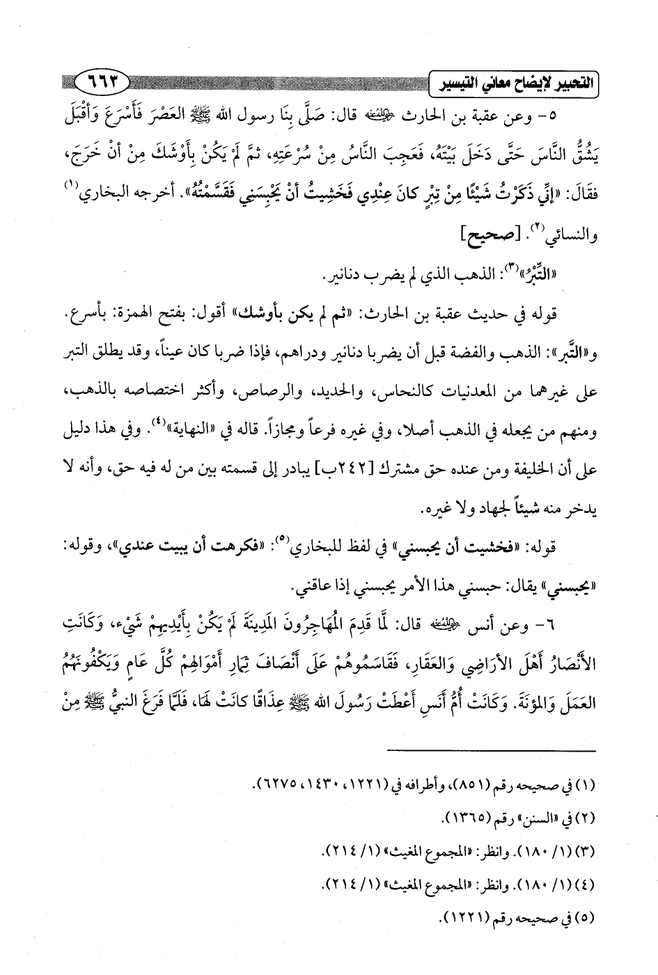 5 - وعن عقبة بن الحارث - رضي الله عنه - قال: صَلَّى بِنَا رسول الله - صلى الله عليه وسلم - العَصْرَ فَأَسْرَعَ وَأقْبَلَ يَشُقُّ النَّاسَ حَتَّى دَخَلَ بَيْتَهُ، فَعَجِبَ النَّاسُ مِنْ سُرْعَتِهِ، ثمَّ لَمْ يَكُنْ بِأَوْشَكَ مِنْ أنْ خَرَجَ، فقَالَ: "إنِّي ذَكَرْتُ شَيْئًا مِنْ تِبْرٍ كانَ عِنْدِي فَخَشِيتُ أنْ يَحْبِسَنِي فَقَسَّمْتُهُ". أخرجه البخاري (¬1) والنسائي (¬2). [صحيح]