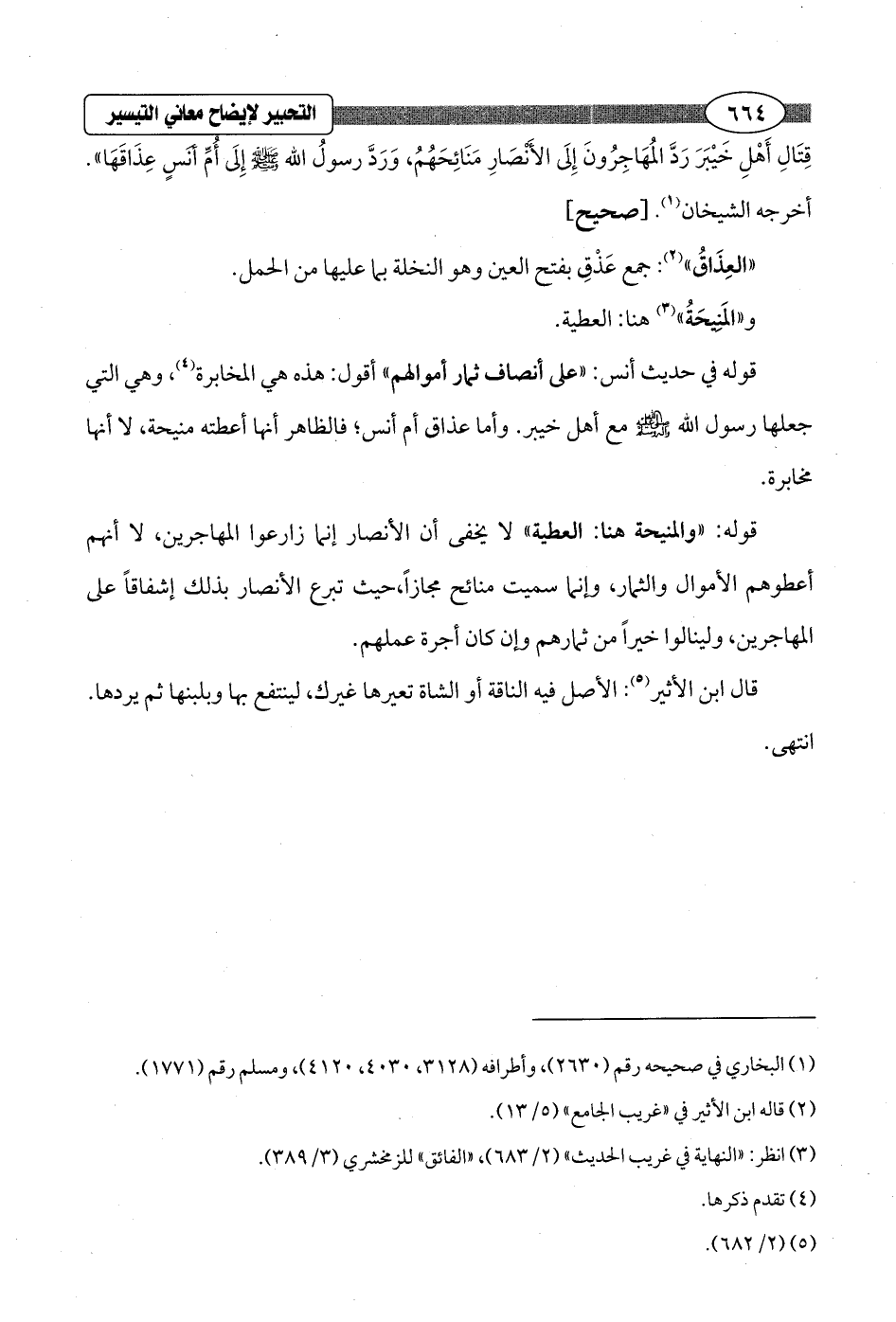 قِتَالِ أَهْلِ خَيْبَرَ رَدَّ المُهَاجِرُونَ إِلَى الأَنْصارِ مَنَائِحَهُمُ، وَرَدَّ رسولُ الله - صلى الله عليه وسلم - إِلَى أُمِّ أنَسٍ عِذَاقَهَا". أخرجه الشيخان (¬1). [صحيح]