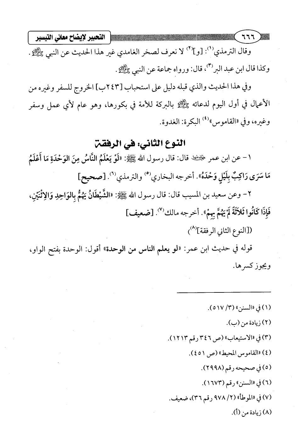 1 - عن ابن عمر - رضي الله عنهما - قال: قال رسول الله - صلى الله عليه وسلم -: "لَوْ يَعْلَمُ النَّاسُ مِنَ الوَحْدَةِ مَا أَعْلَمُ مَا سَرَى رَاكِبٌ بِلَيْلٍ وَحْدَهُ". أخرجه البخاري (¬5) والترمذي (¬6). [صحيح]