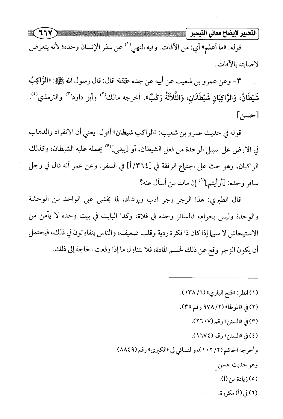 3 - وعن عمرو بن شعيب عن أبيه عن جده - رضي الله عنه - قال: قال رسول الله - صلى الله عليه وسلم -: "الرَّاكِبُ شَيْطَانٌ، وَالرَّاكِبَانِ شَيْطَانَانِ، وَالثَّلاَثَةُ رَكْبٌ". أخرجه مالك (¬2) وأبو داود (¬3) والترمذي (¬4). [حسن]