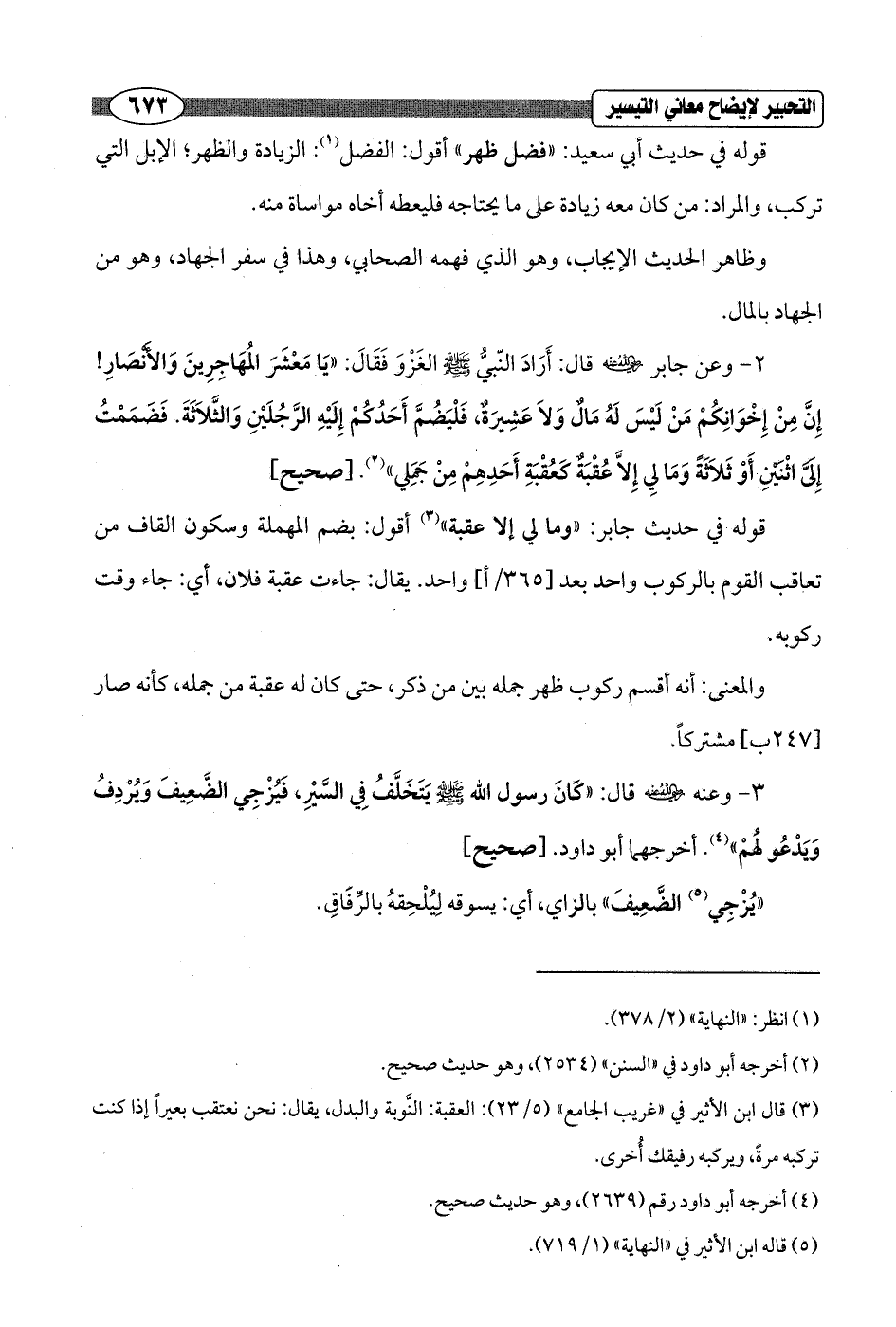 3 - وعنه - رضي الله عنه - قال: "كَانَ رسول الله - صلى الله عليه وسلم - يَتَخَلَّفُ في السَّيْرِ، فَيُزْجِي الضَّعِيفَ وَيُرْدِفُ وَيَدْعُو لهُمْ" (¬4). أخرجهما أبو داود. [صحيح]