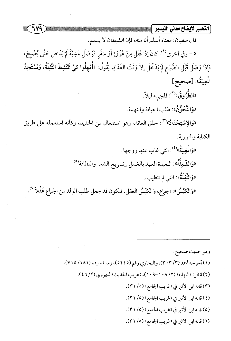 5 - وفي أخرى (¬1): كانَ إذَا قَفَلَ مِنْ غَزْوَةٍ أَوْ سَفَرٍ فَوَصَلَ عَشِيَّةً لَمْ يَدْخل حَتَّى يُصْبِحَ، فَإِذَا وَصَلَ قَبْلَ الصُّبْحِ لَمْ يَدْخُلْ إلاّ وَقْتَ الغَدَاةِ، يَقُولُ: "أُمْهِلُوا كيْ تَمْتَشِطَ التَّفِلَةُ, وَتَسْتَحِدُ "المُغِيبَةُ. [صحيح]