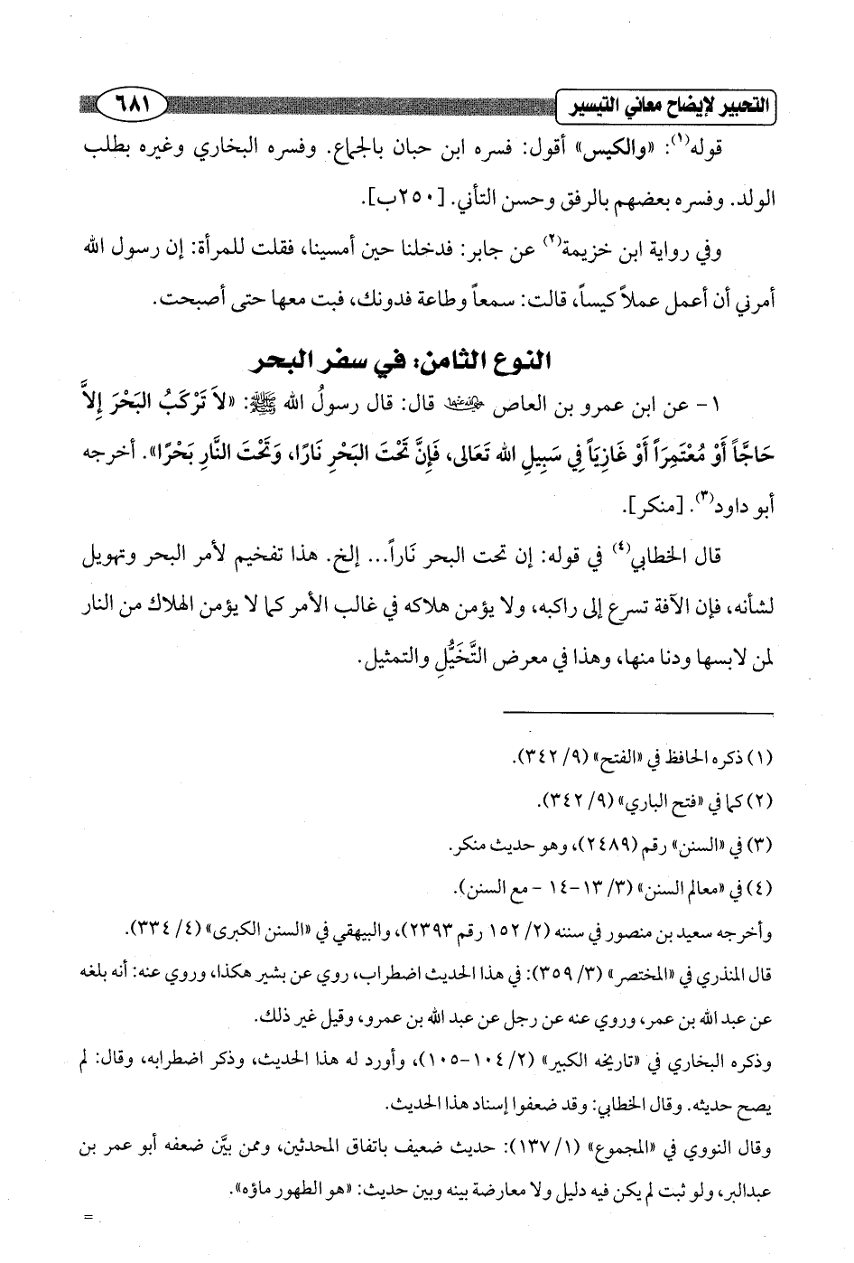1 - عن ابن عمرو بن العاص - رضي الله عنهما - قال: قال رسولُ الله - صلى الله عليه وسلم -: "لاَ تَرْكَبُ البَحْرَ إِلاَّ حَاجَّاً أَوْ مُعْتَمِرَاً أَوْ غَازِيَاً فِي سَبِيلِ الله تَعَالى، فَإِنَّ تَحْتَ البَحْرِ نَارًا، وَتَحْتَ النَّارِ بَحْرًا". أخرجه أبو داود (¬3). [منكر].