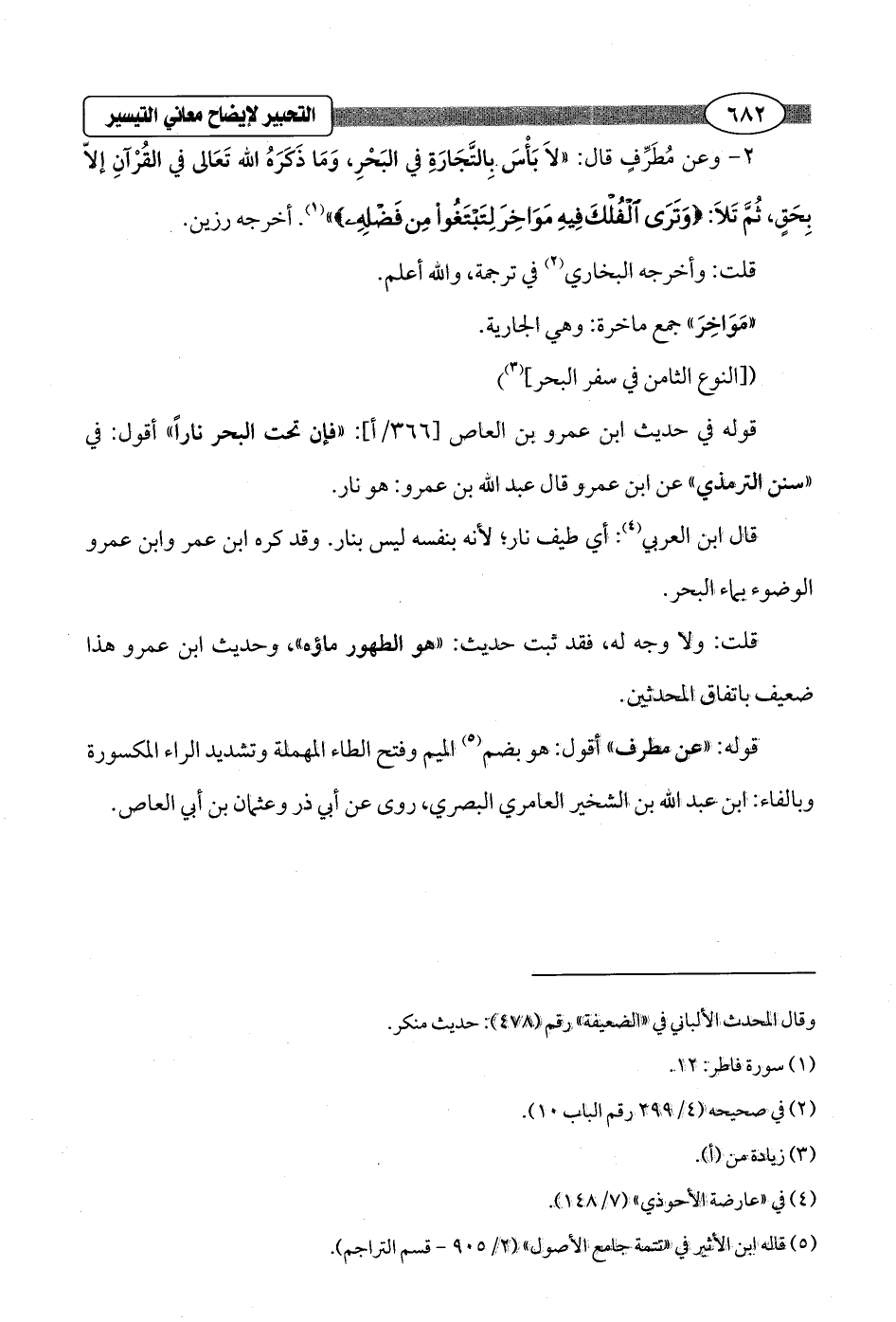 2 - وعن مُطَرِّفٍ قال: "لاَ بَأْسَ بِالتَّجَارَةِ في البَحْرِ، وَمَا ذَكَرَهُ الله تَعَالى في القُرْآنِ إلاّ بِحَقٍ، ثُمَّ تَلاَ: {وَتَرَى الْفُلْكَ فِيهِ مَوَاخِرَ لِتَبْتَغُوا مِنْ فَضْلِهِ} " (¬1). أخرجه رزين.