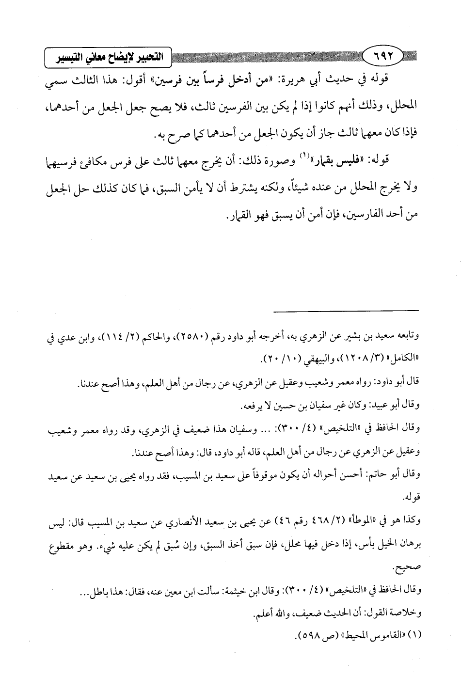 وكذا هو في "الموطأ" (2/ 468 رقم 46) عن يحيى بن سعيد الأنصاري عن سعيد بن المسيب قال: ليس برهان الخيل بأس، إذا دخل فيها محلل، فإن سبق أخذ السبق، وإن سُبق لم يكن عليه شيء. وهو مقطوع صحيح.